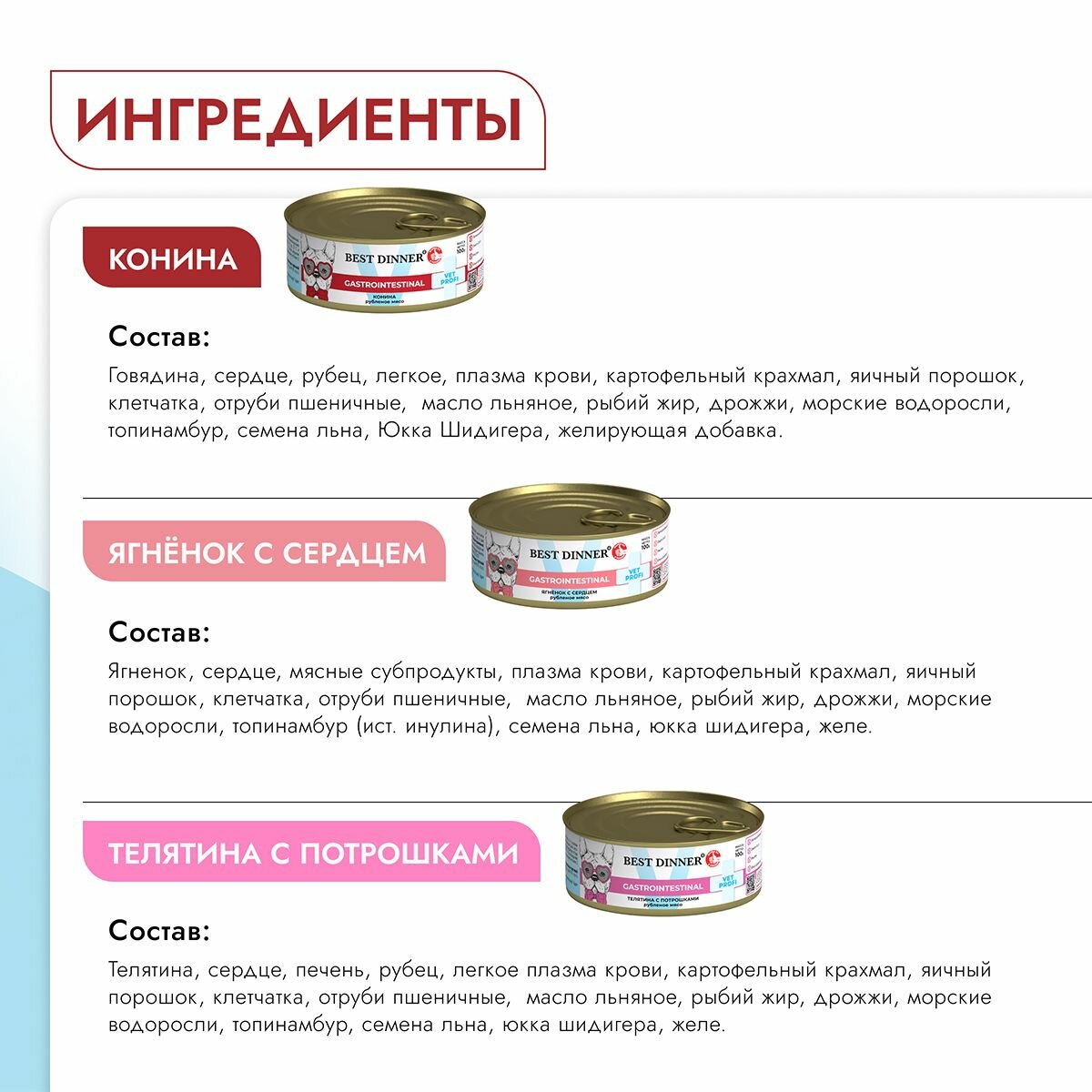 Ниже Вы можете прочитать отзывы на Влажный диетический корм Best Dinner Vet Profi GastroIntestinal для собак при заболевании ЖКТ Ассорти (12шт х 100гр), ознакомится с подробными характеристиками, посмотреть интересные обзоры и фотографии на Влажный диетический корм Best Dinner Vet Profi GastroIntestinal для собак при заболевании ЖКТ Ассорти (12шт х 100гр).