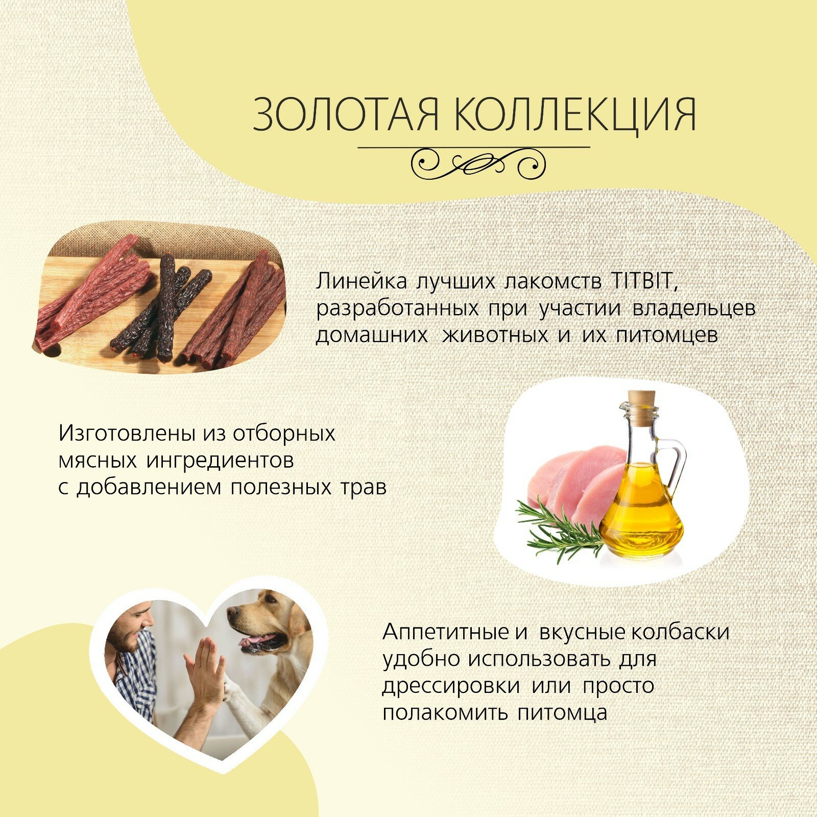 | Плюсы: | Отличная вкусняшка для моего любимого друга Йорка. Нам уже 12 лет и зубов недостаточное количества осталось , но именно эти пармские колбаски нам в самый раз . Сама бы с удовольствием съела , но как говорил мой папа ,, Хороший хозяин сам не съест, собаке отдаст, , Две упаковочки нам хватает на неделю и заказываем сново и снова. Вообще TitBit отличная продукция для наших питомцев. И вкусно , и бюджетно. Так , что заказывала и буду заказывать дальше. |