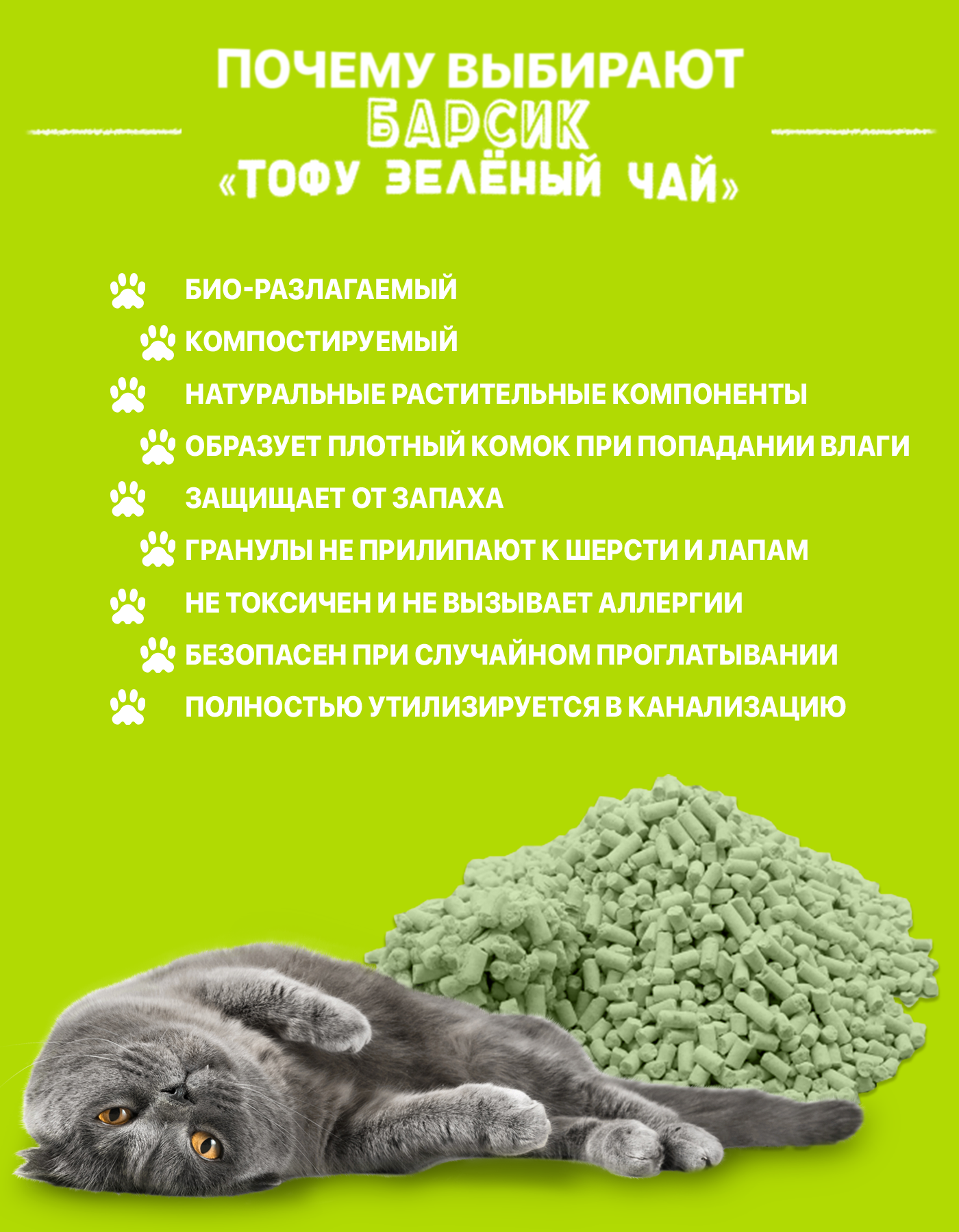 Натуральный соевый тофу наполнитель для кошачьих туалетов комкующийся Барсик TOFU Зеленый чай 15 л