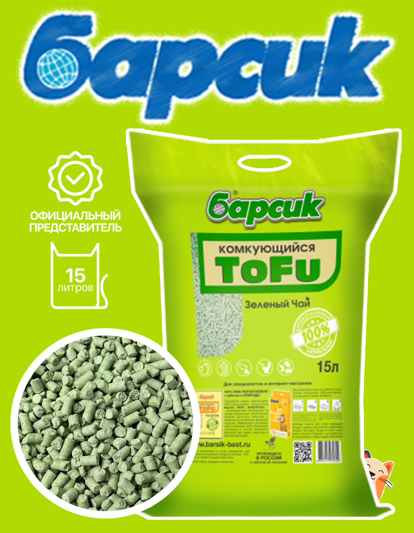 Барсик TOFU зелёный ЧАЙ наполнитель древесный комкующийся для туалета кошек (15 л)