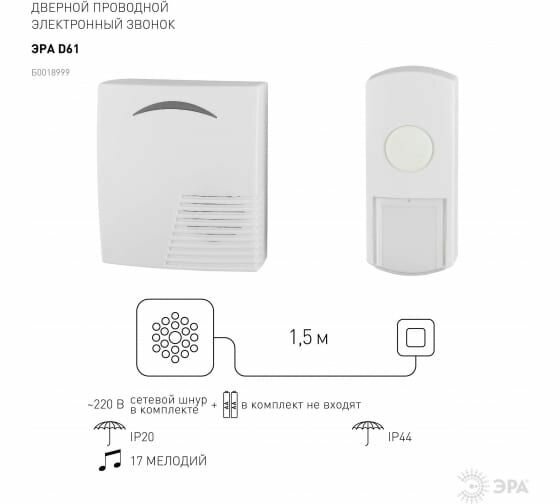 Звонок Эра D61, проводной, мелодий 17, белый [б0018999]