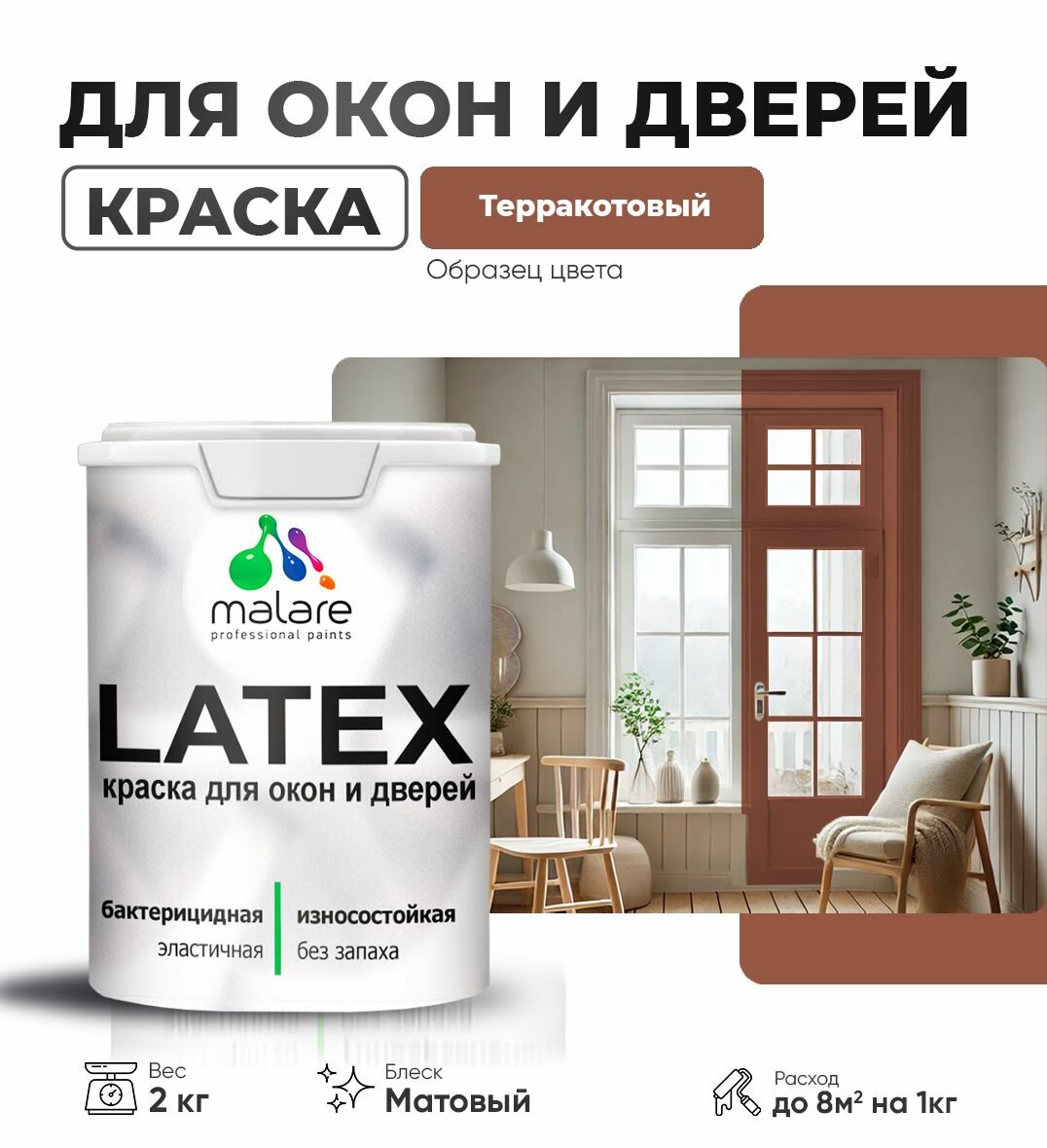 Купить Акриловая краска для дверей и окон Malare Latex по дереву с антисептическим эффектом/ быстросохнущая моющаяся без запаха матовая, терракотовый, 2 кг.