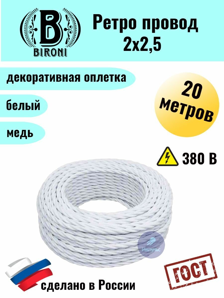 BIRONI Ретро Витой провод 2х2,5 Белый 20м