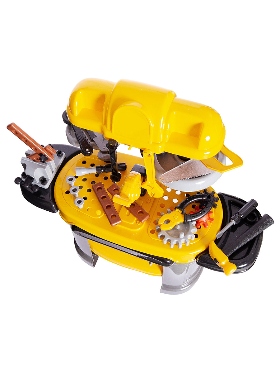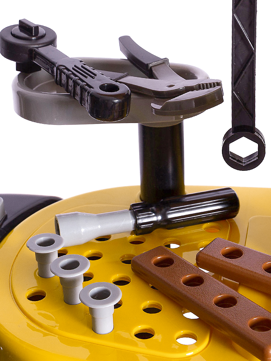 | Комплектация | стол, нижняя полка для хранения (32х22см), молоток, гаечный ключ, плоскогубцы (14х6см), пила (19х8см), ключ накидной, тиски, каска (диаметр 48см), разводной ключ, 2 отвертки, 3 шестеренки, 16 шурупов, 6 гвоздей, 8 гаек, 2 заготовки с отверстиями (19х5см), 2 насадки, наклейки |