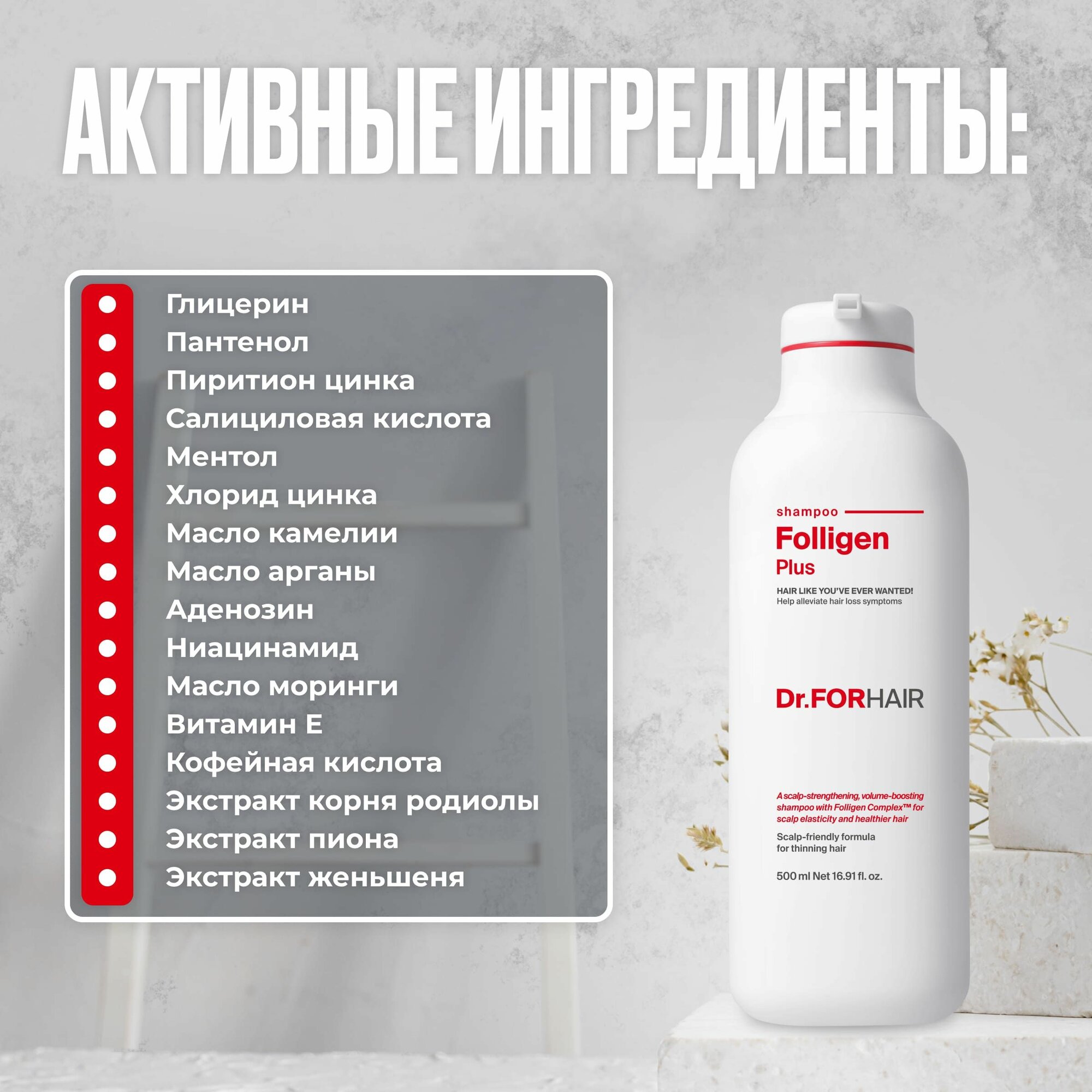 Шампунь-крем интенсивный для укрепления корней и стимуляции роста волос с эффектом против жирности и перхоти Folligen Plus Dr. For Hair, 500 мл