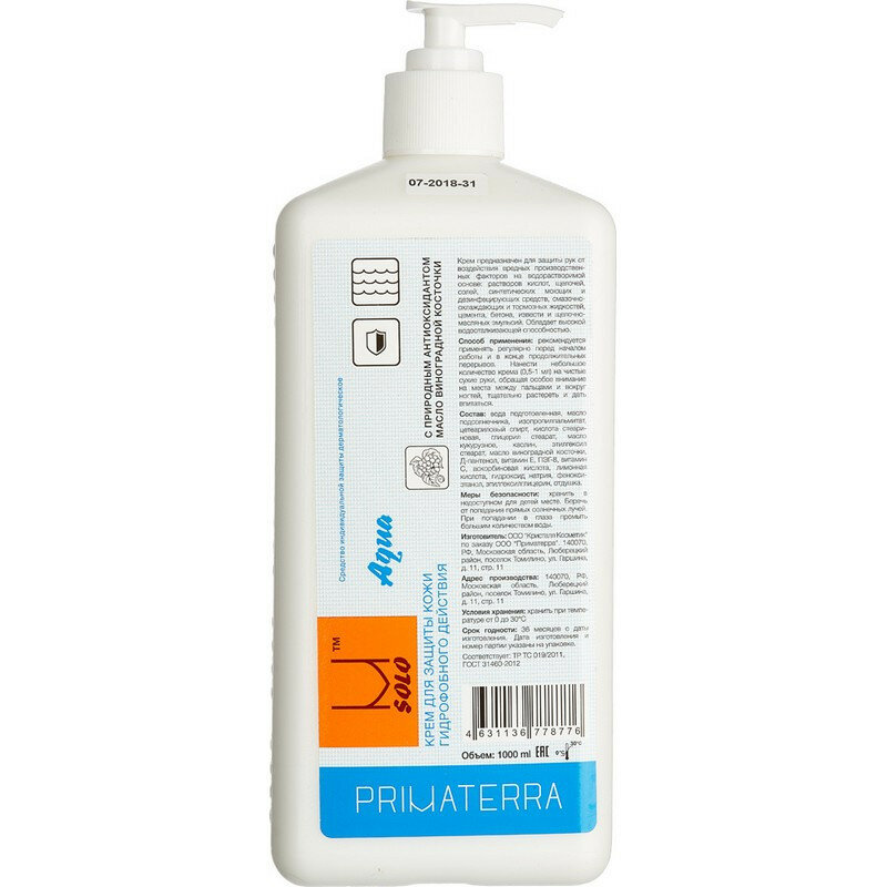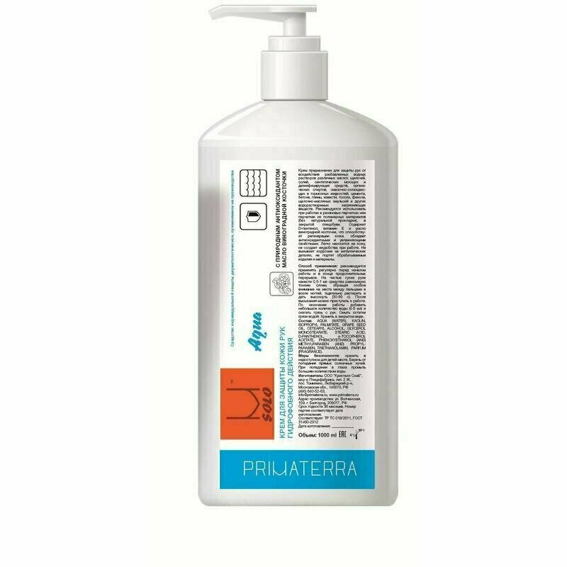 Крем для защиты кожи гидрофобного действия TM Primaterra M Solo Aqua флакон с помпой 1000 мл 8776
