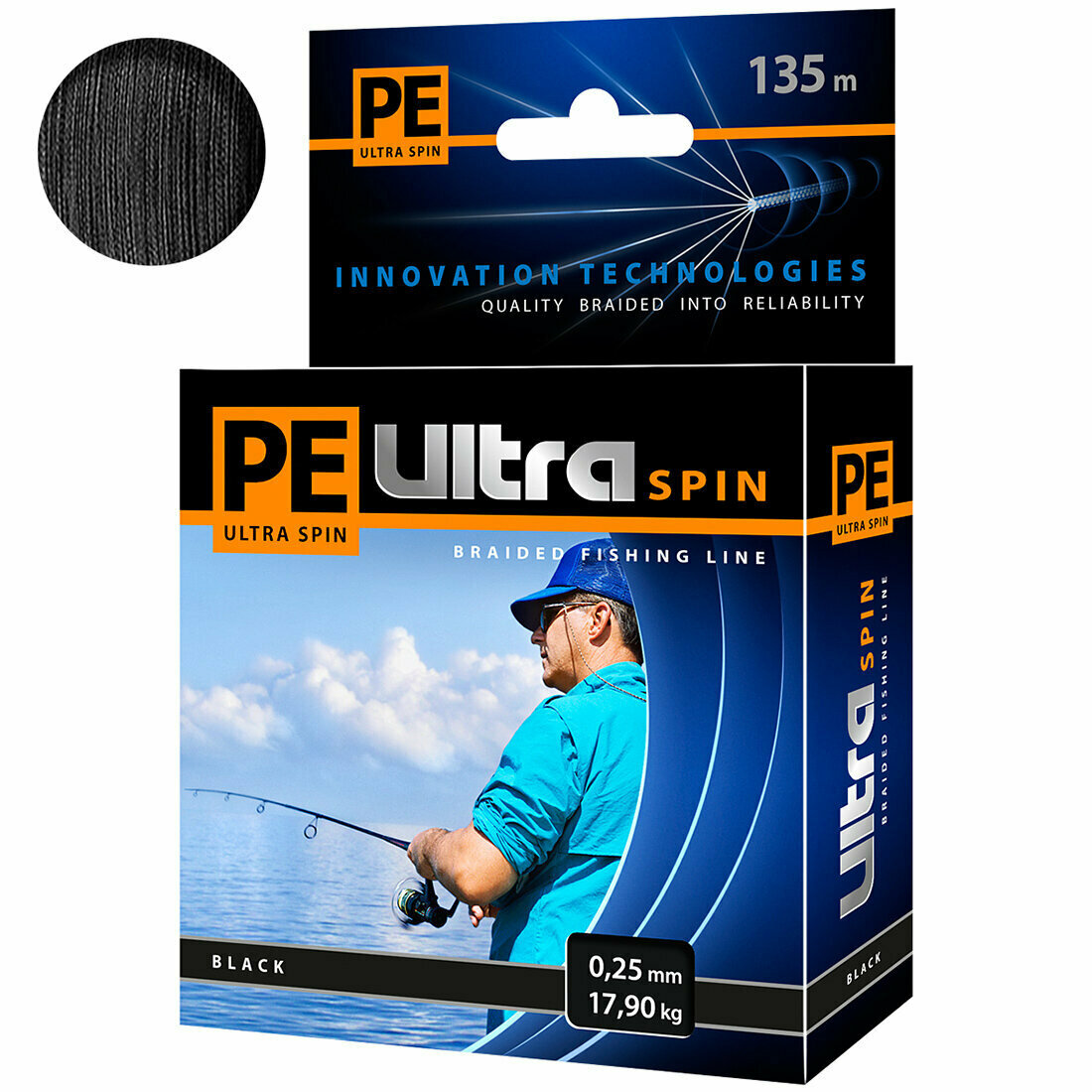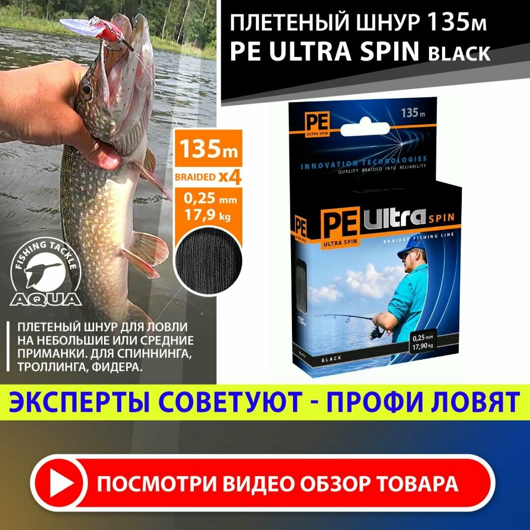 Плетеный шнур для рыбалки AQUA PE ULTRA SPIN Black 0,25mm 135m, цвет - черный, test - 17,90kg (набор 2 шт)