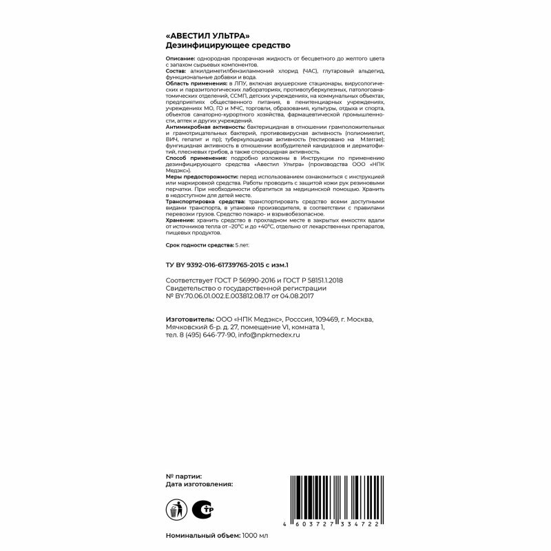 Средство дезинфицирующее 1л авестил ультра, концентрат (цена за 1 ед.товара)