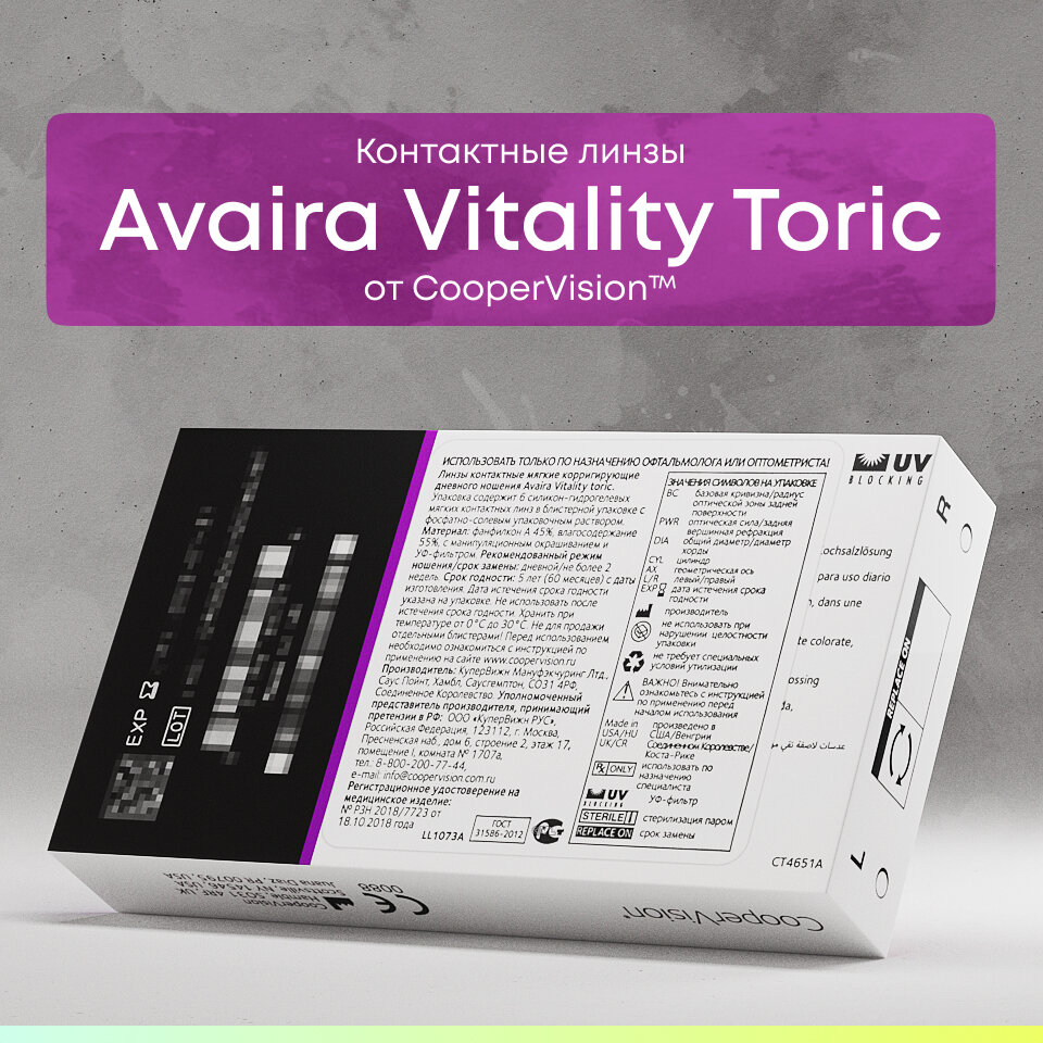 Контактные линзы Avaira Vitality toric R 8.5, D -6.5, CYL -1.25, AX 30, DIA 14.5, 6 линз
