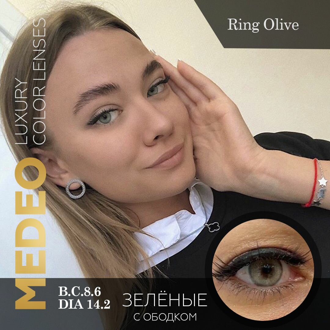 СохранитьЦветные контактные линзы Medeo Ring Olive 3 месяца, -5.0 / 14.2 / 8.6, зеленый, оливковый, с ободком 2 шт. интересное: