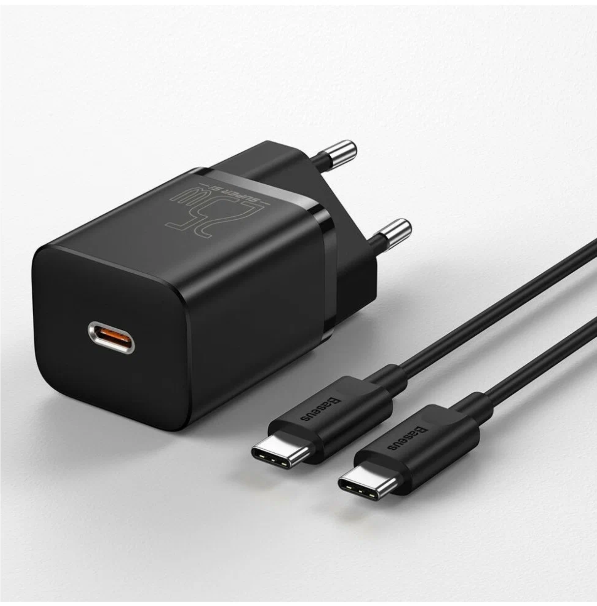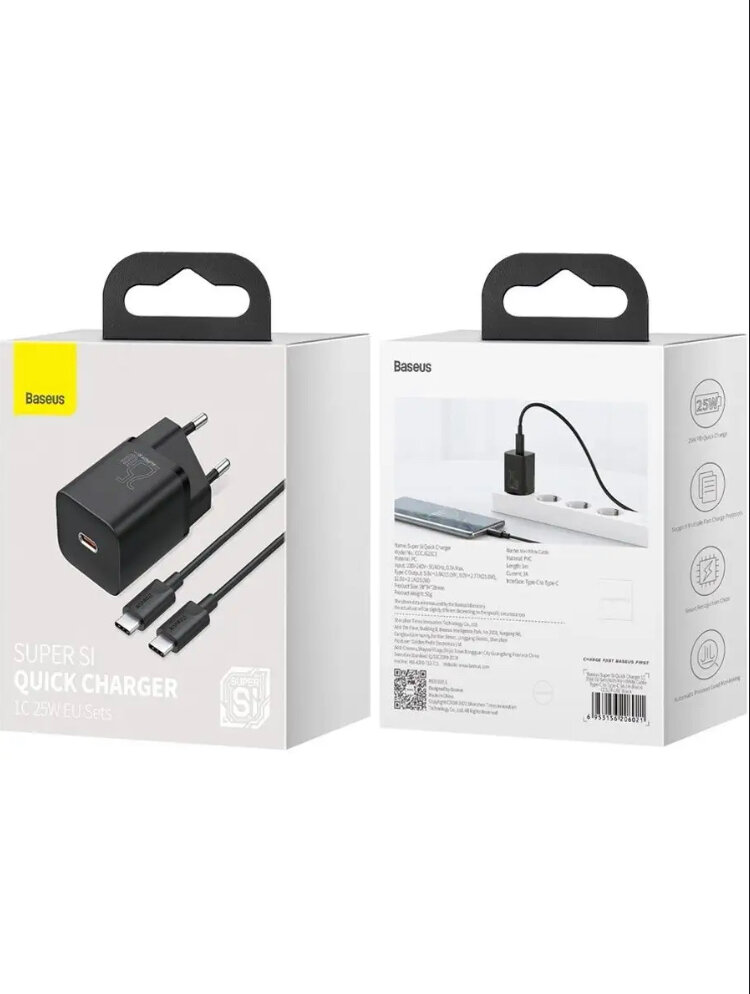 Зарядное устройство для телефона BASEUS Super Si USB-C + Кабель Type-C-Type-C, 3A, 25W, черный