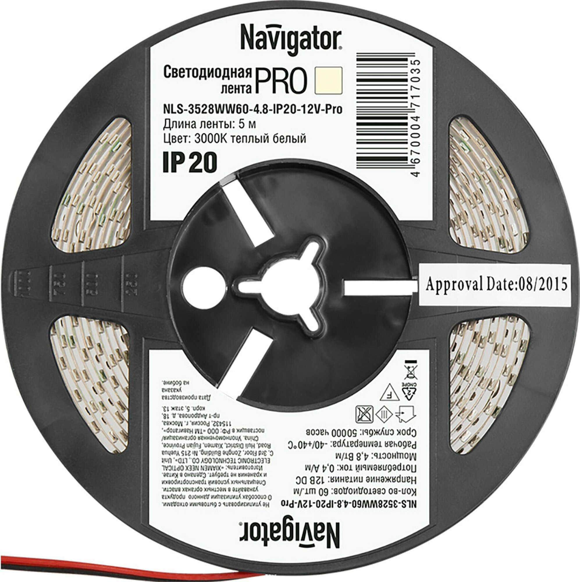 Лента светодиодная 71 703 NLS-3528WW60-4.8-IP20-12V-Pro R5 4.8Вт/м (уп.5м) тепл. бел., NAVIGATOR 71703 (1 упак)