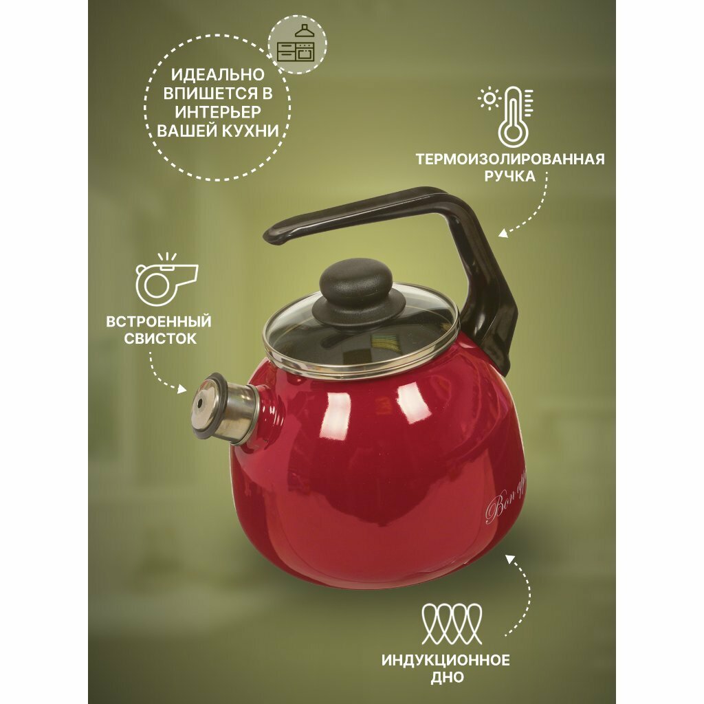 "Bon appetit" Чайник эмалированный 3л, д12,5см, h16см, со свистком, сферическая форма, стеклянная крышка, вишневый