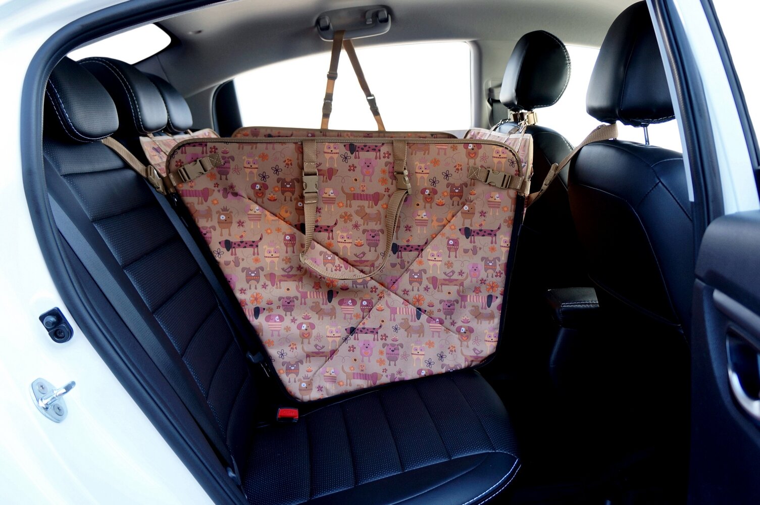Автогамак для перевозки собак Happy Dog (Хэппи Дог). На 1/3 заднего сиденья. Цвет: собаки на бежевом фоне.