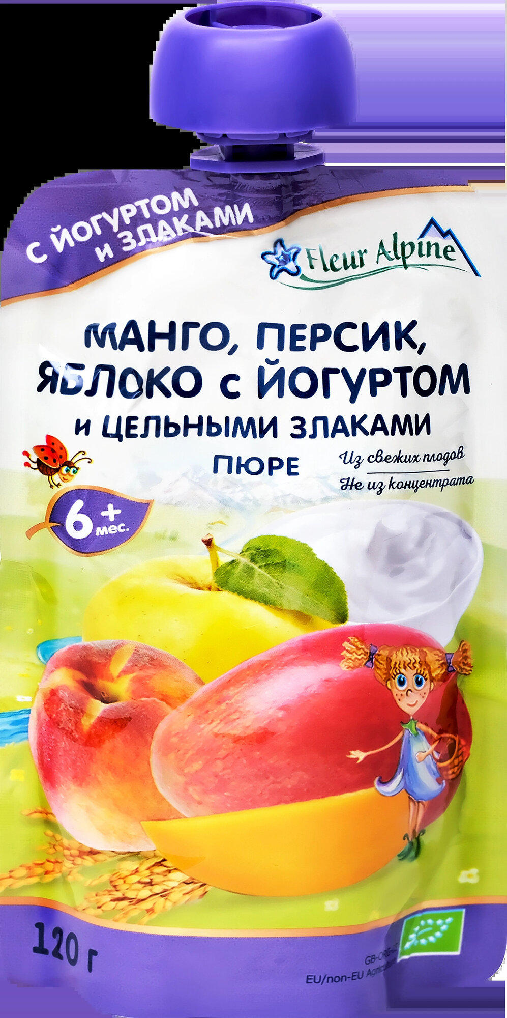 Пюре детское Fleur Alpine манго, персик, яблоко с йогуртом и цельными злаками, с 6 месяцев, 120 г (6 штук)