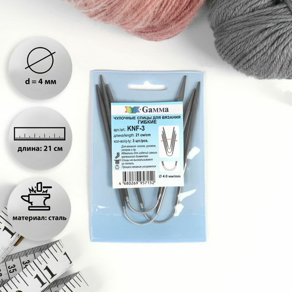 Спицы для вязания GAMMA гибкие, чулочные, металлические, d4мм, 21см, 3шт, 1шт