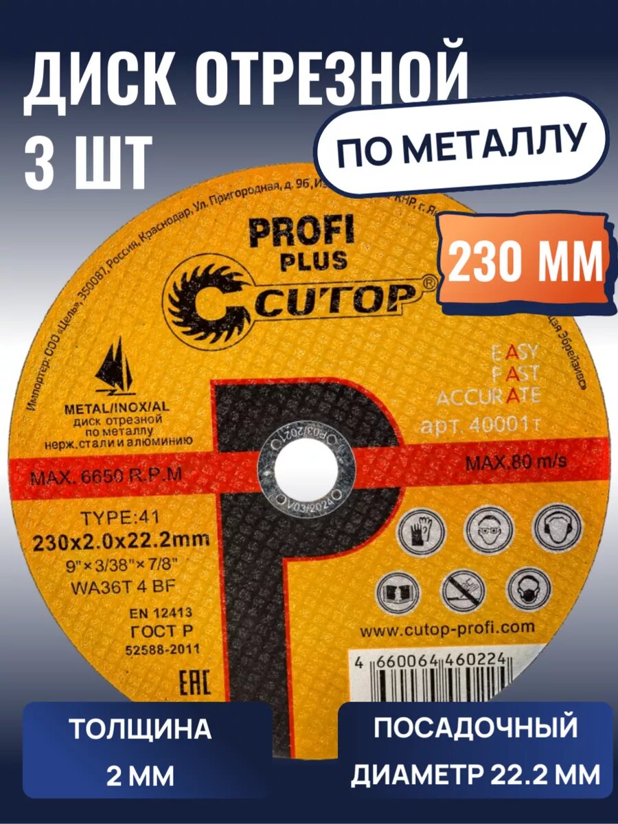 Профессиональный диск отрезной по металлу и нержавеющей стали CUTOP Profi Plus, Т41-230 х 1,8 х 22,2 мм, 3 шт