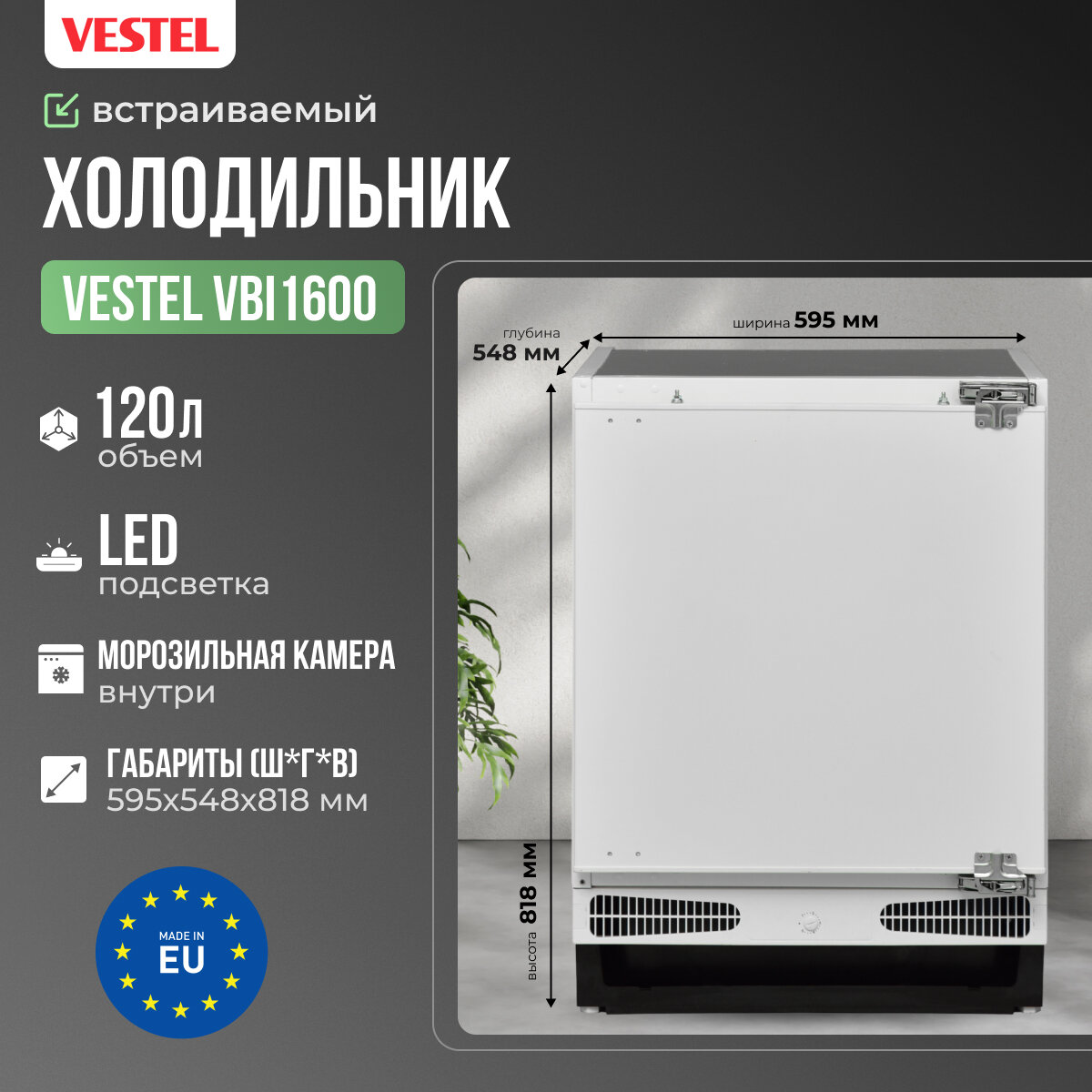 Vestel Встраиваемый Холодильник Маленький с Морозилкой Однокамерный Vbi1600 интересное: