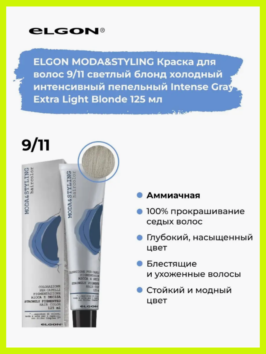 Купить Крем - краска для волос профессиональная Elgon Moda&Styling 9/11 Блонд Насыщенный пепельный 125 мл