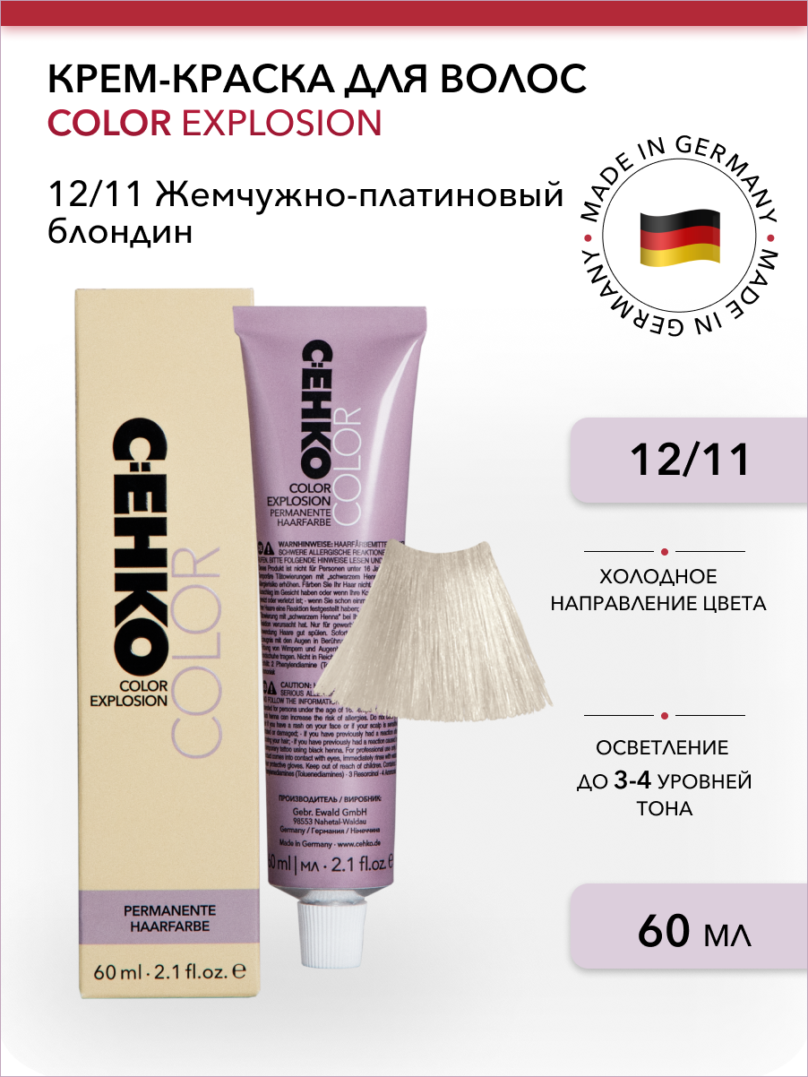 Профессиональная краска для волос 10/11 Ультра светлый жемчужный блондин, холодный, для блонда, стойкая, перманентная, для седых волос, 60 мл, C:EHKO COLOR EXPLOSION