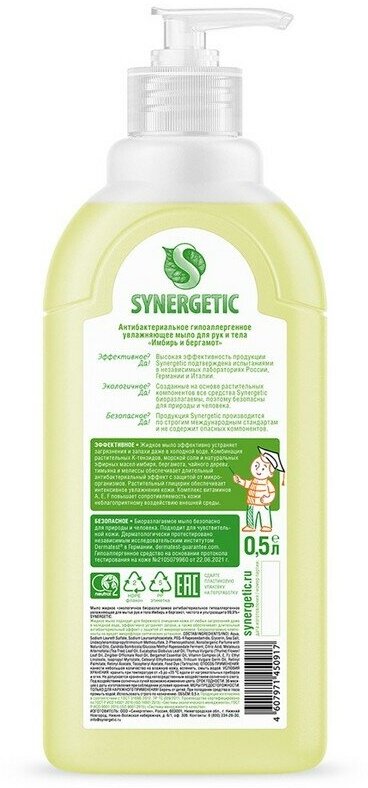 Мыло жидкое экологичное Synergetic, антибактериальное, гипоаллергенное, имбирь и бергамот, 0.5 л Syn
