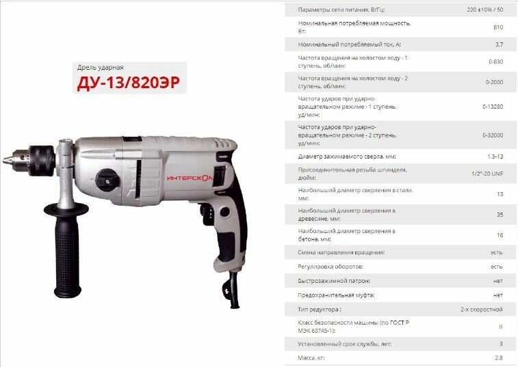 Ниже Вы можете прочитать отзывы на Дрель ударная электрическая ИНТЕРСКОЛ ДУ-13/820ЭР (810Вт, ключ патрон-13мм, 2скорости, метал редуктор, 2,8кг, коробка), ознакомится с подробными характеристиками, посмотреть интересные обзоры и фотографии на Дрель ударная электрическая ИНТЕРСКОЛ ДУ-13/820ЭР (810Вт, ключ патрон-13мм, 2скорости, метал редуктор, 2,8кг, коробка).
