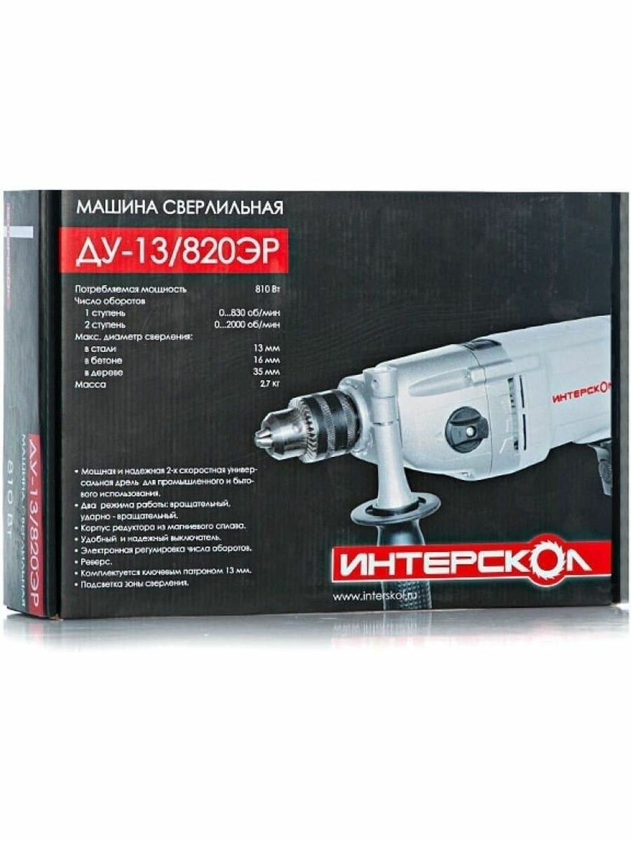 Купить Дрель ударная электрическая ИНТЕРСКОЛ ДУ-13/820ЭР (810Вт, ключ патрон-13мм, 2скорости, метал редуктор, 2,8кг, коробка)