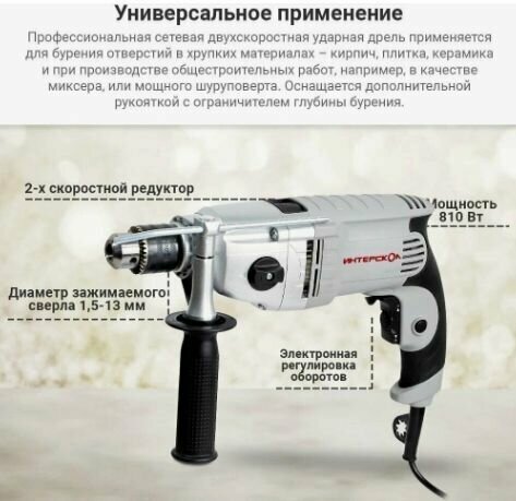 СохранитьДрель ударная электрическая ИНТЕРСКОЛ ДУ-13/820ЭР (810Вт, ключ патрон-13мм, 2скорости, метал редуктор, 2,8кг, коробка) интересное: