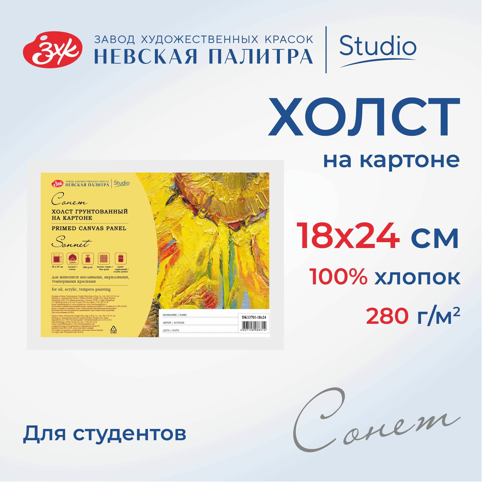 Завод художественных красок «Невская палитра» Холст на картоне 18 х 24 см, хлопок 100%, 3.0 мм, акриловый грунт, мелкозернистый, ЗХК "Сонет"