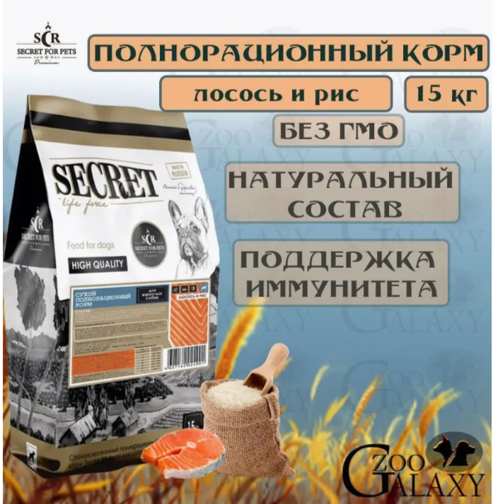 Купить SECRET FOR PETS Корм для взрослых собак всех пород с лососем и рисом, 15кг