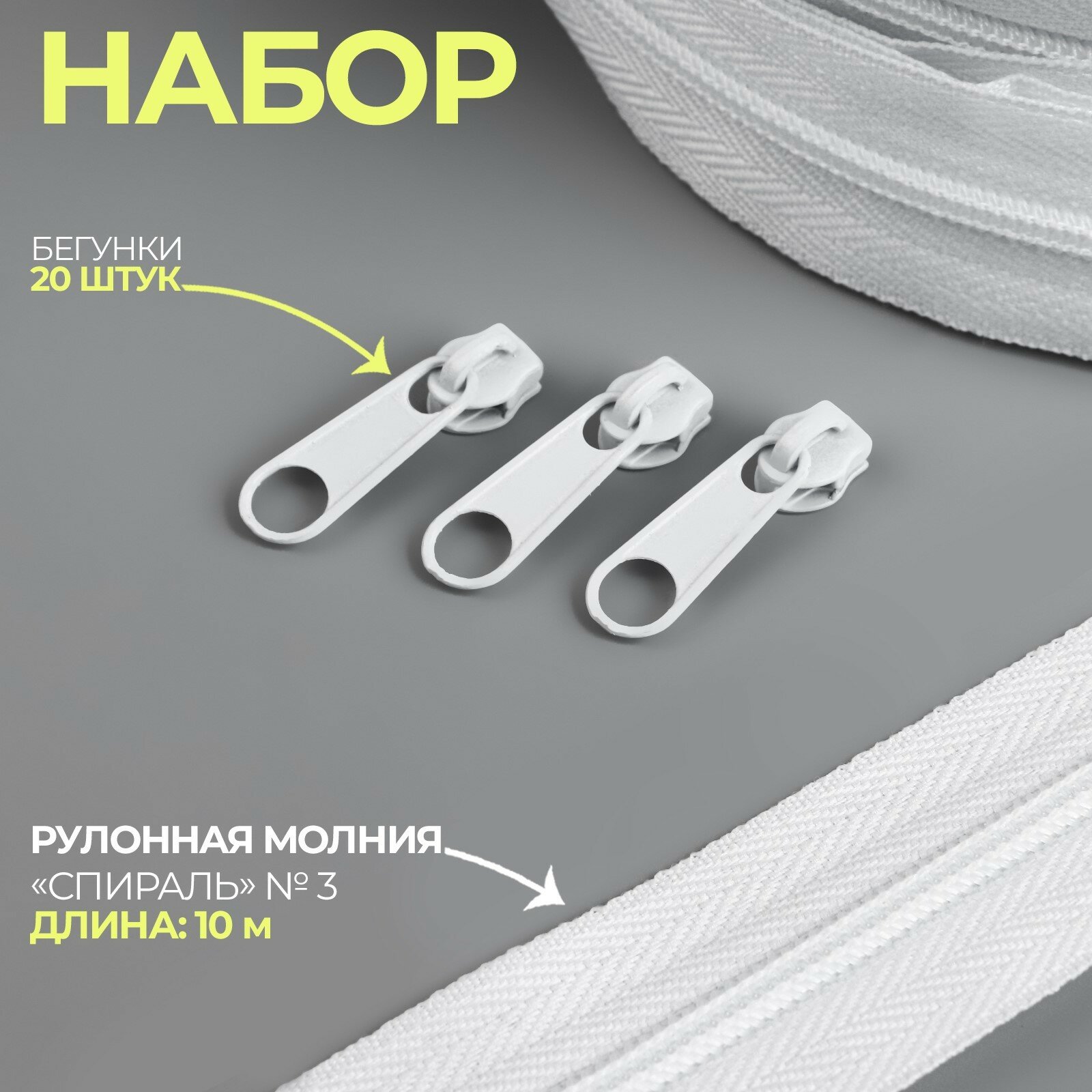 Купить Набор: рулонная молния "Спираль" №3, 10 м, 20 бегунков, 40 верхних ограничителей, 20 нижних ограничителей, цвет белый