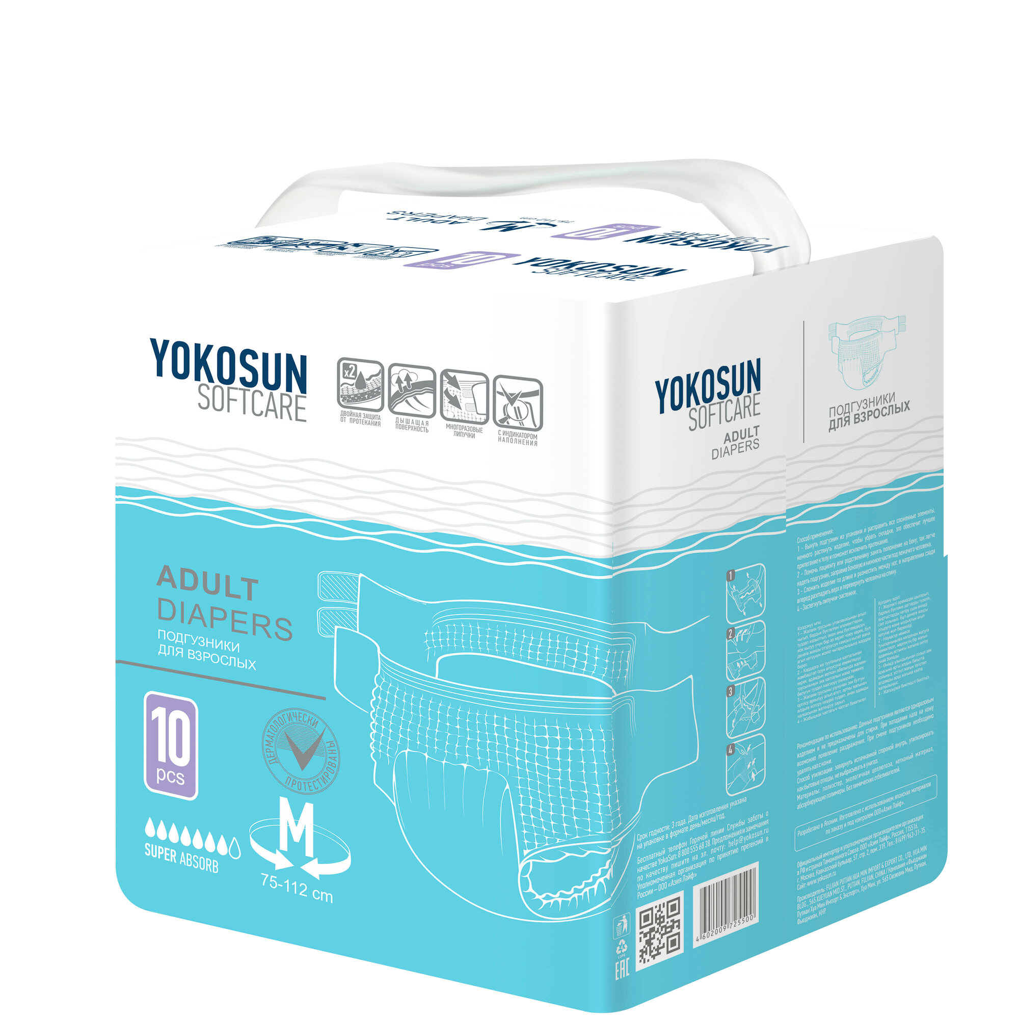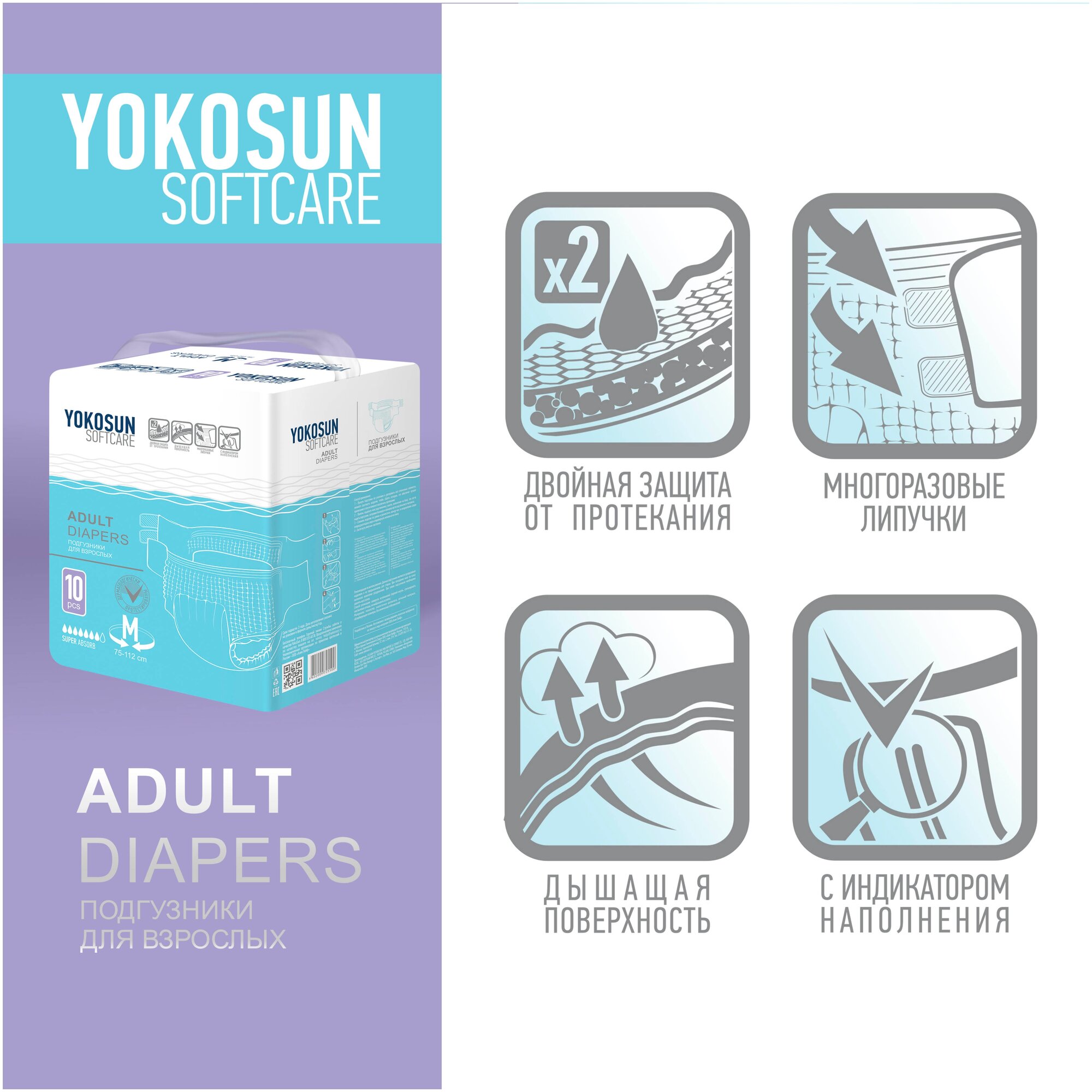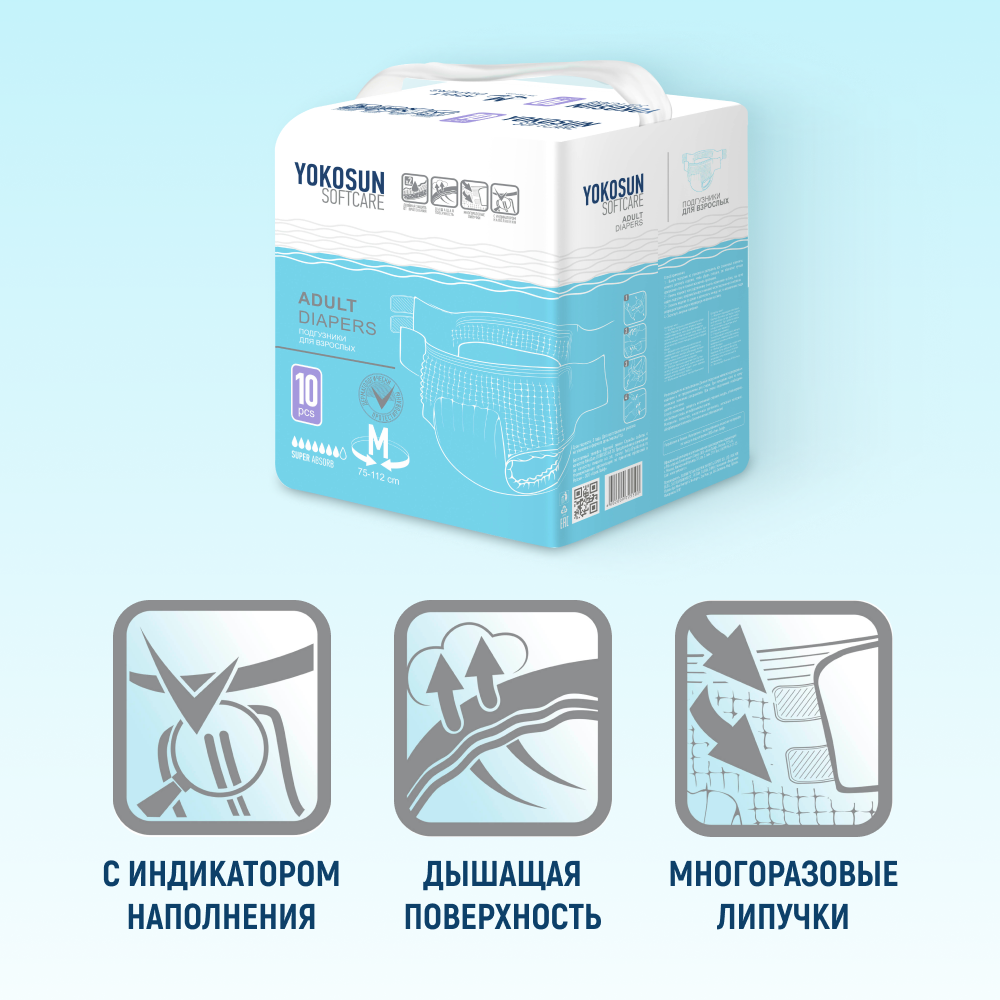 Подгузники для взрослых YokoSun Softcare Adult diapers, M, 75-112 см, 10 шт.