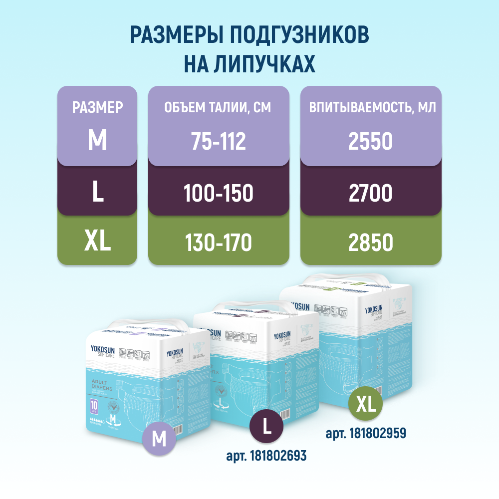 Подгузники для взрослых YokoSun Large, объем талии 100-150 см, 10 шт.