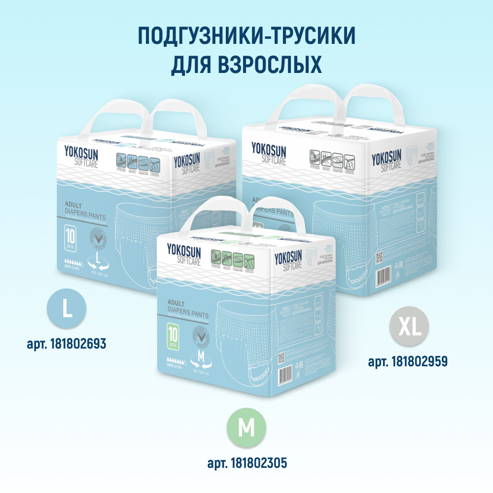 Подгузники для взрослых YokoSun Softcare на липучках, размер XL, 10 шт.