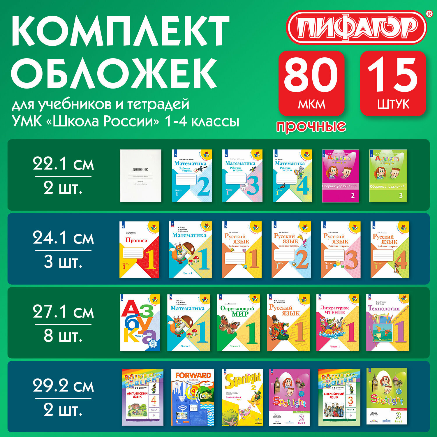 Купить Набор обложек для начальных классов 15 шт., 221х460-2 шт, 241х450-3 шт, 271х420-8 шт, 292х442-2 шт, клейкий край, ПП 80 мкм, пифагор, 271264