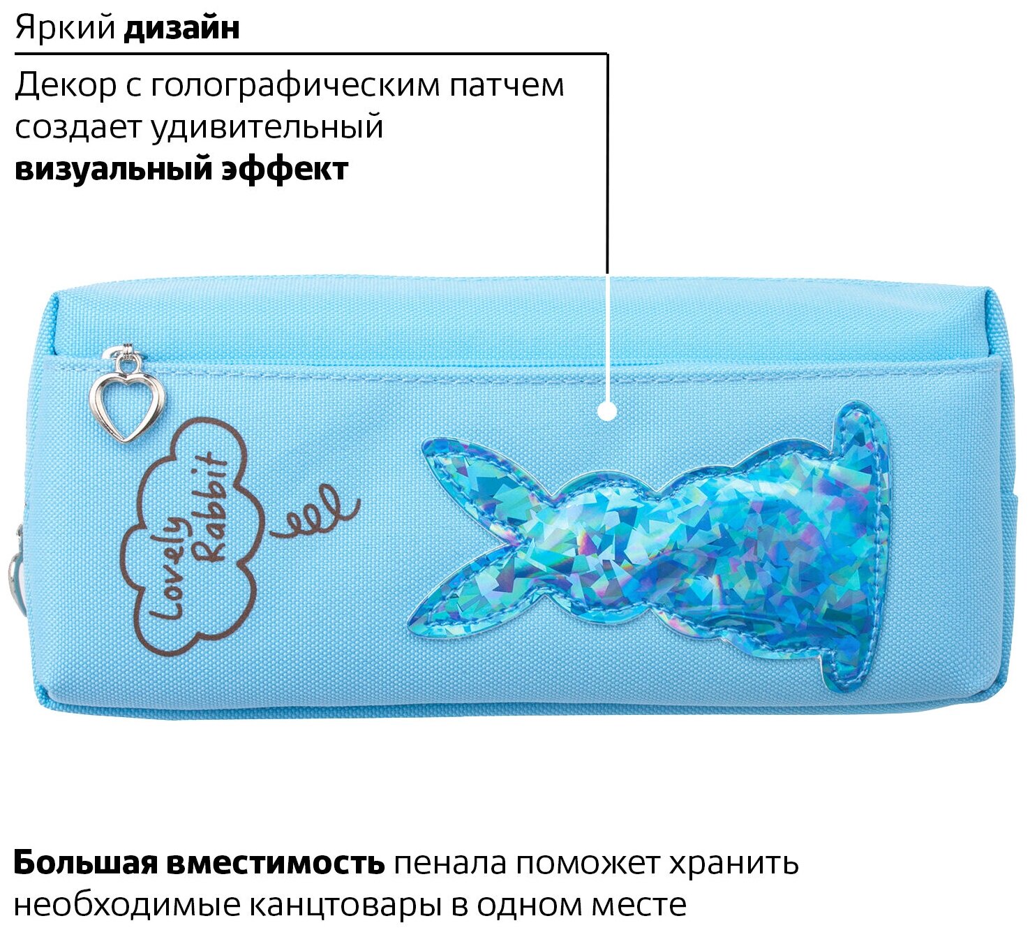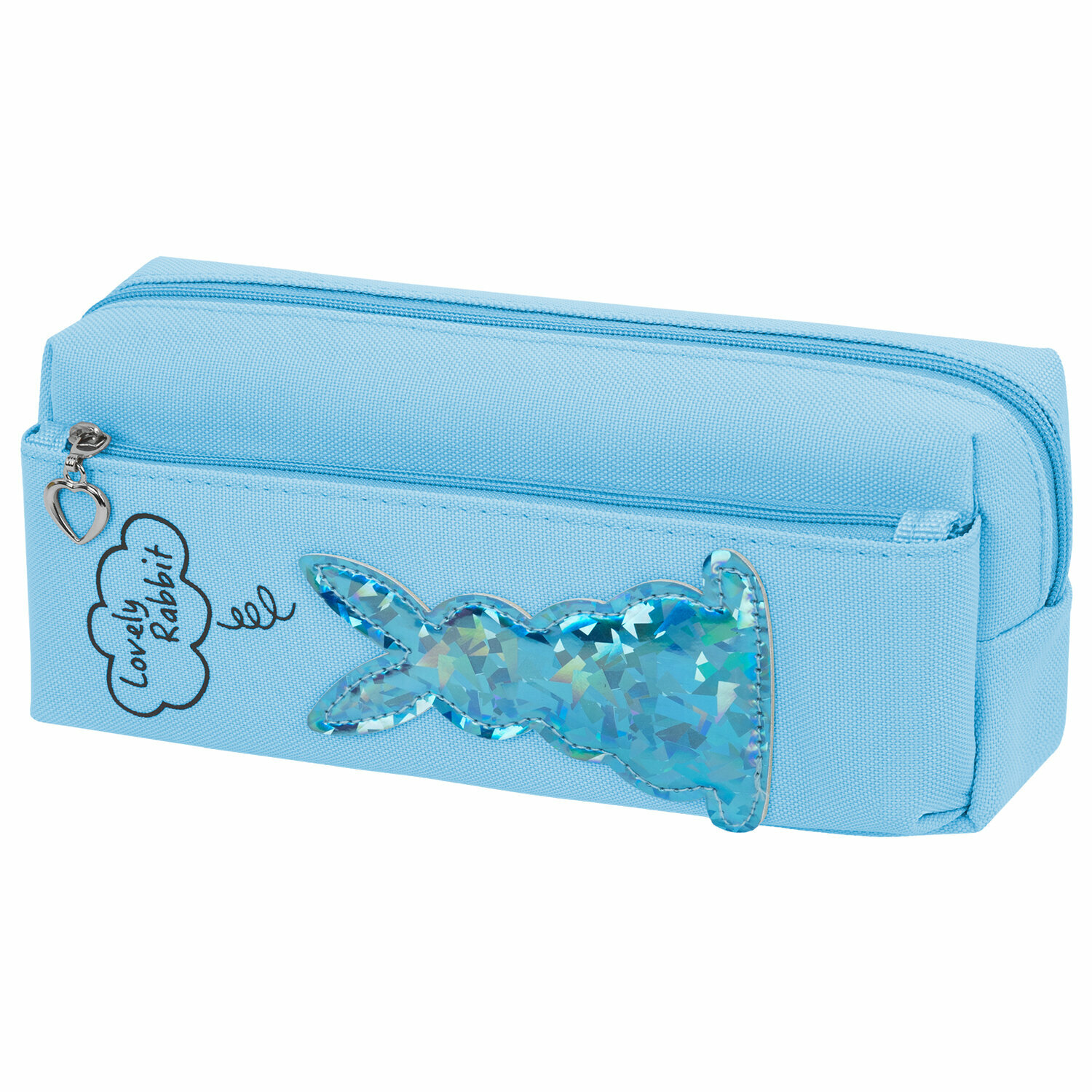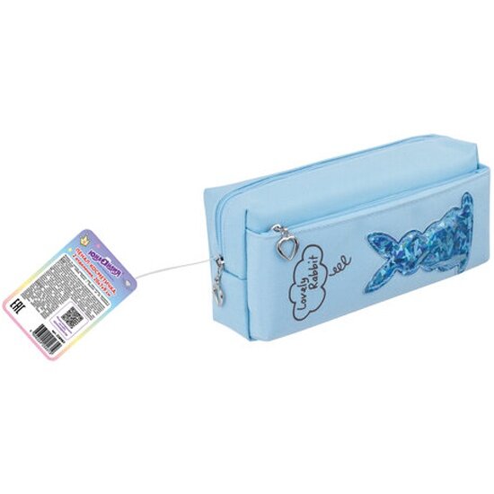 Пенал-косметичка школьный для ручек, карандашей для девочки/подростка Юнландия, 2 отделения, мягкий, Зайка, голубой, 20х7х9 см