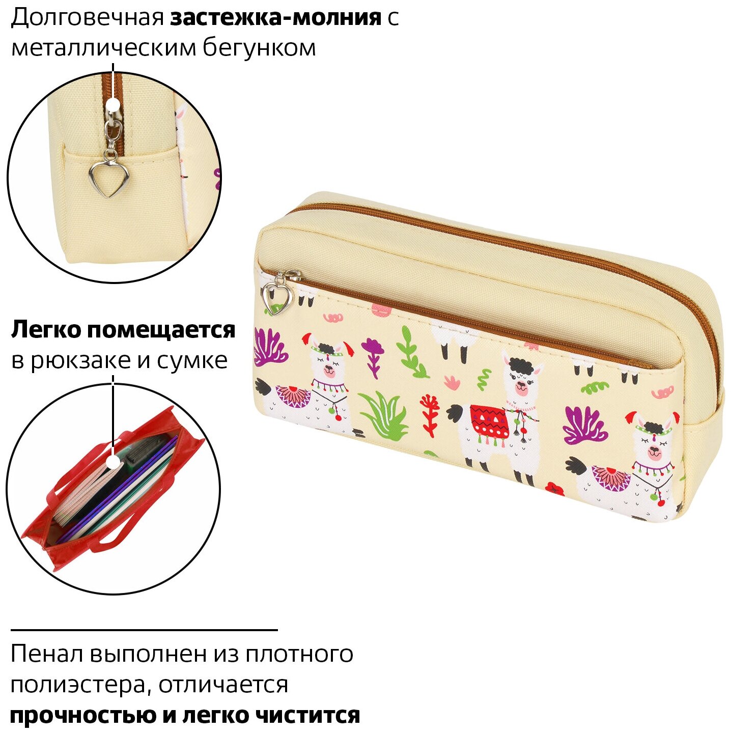 Комплект 5 шт, Пенал-косметичка юнландия, 2 отделения, мягкий, "Ламы", бежевый, 20х6х9 см, 228981