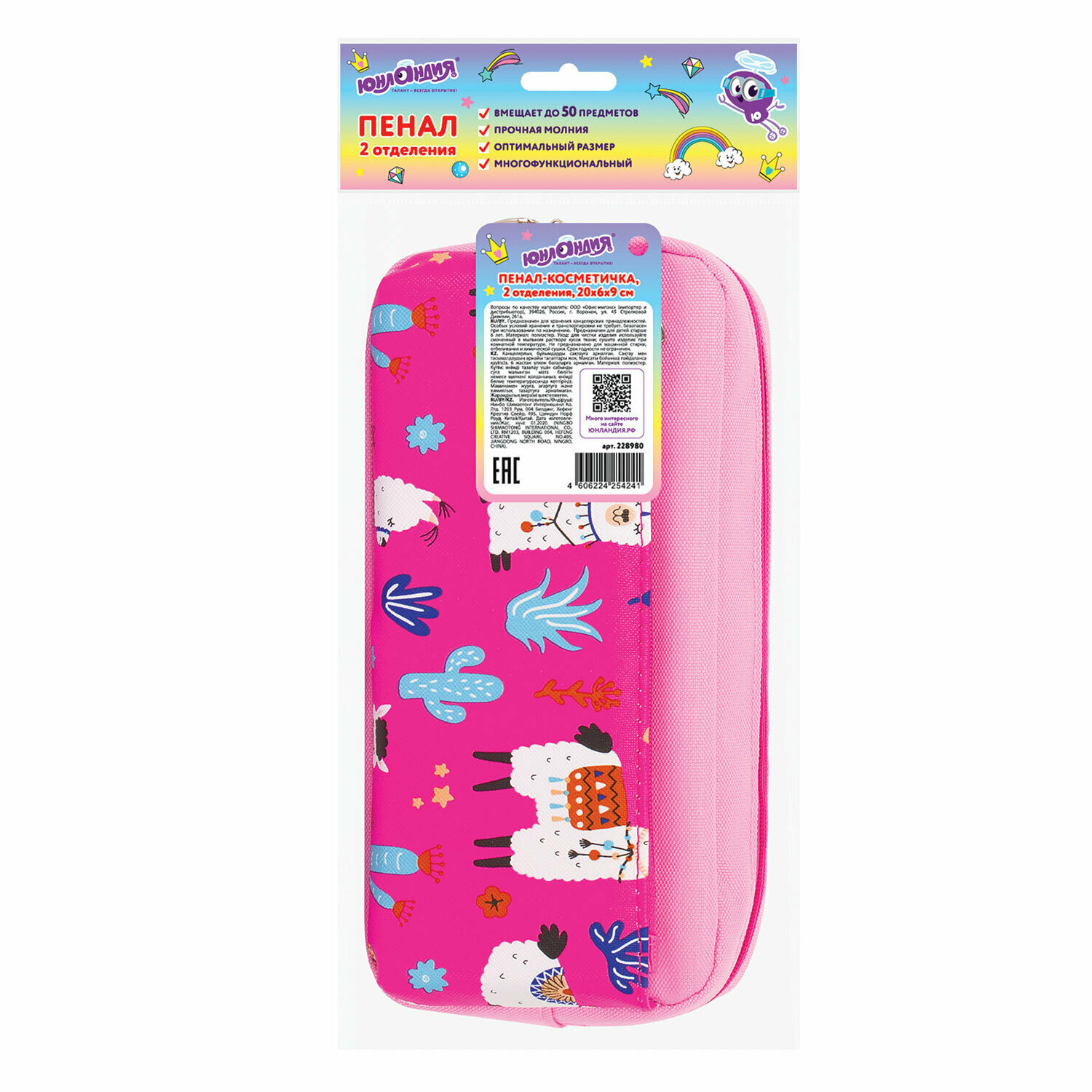 Комплект 7 шт, Пенал-косметичка юнландия, 2 отделения, мягкий, "Ламы", бежевый, 20х6х9 см, 228981
