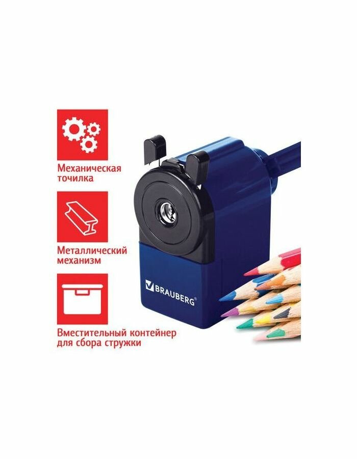 СохранитьТочилка механическая настольная для карандашей с контейнером для стружки Brauberg Jet, металлический механизм, корпус синий, 229570 интересное: