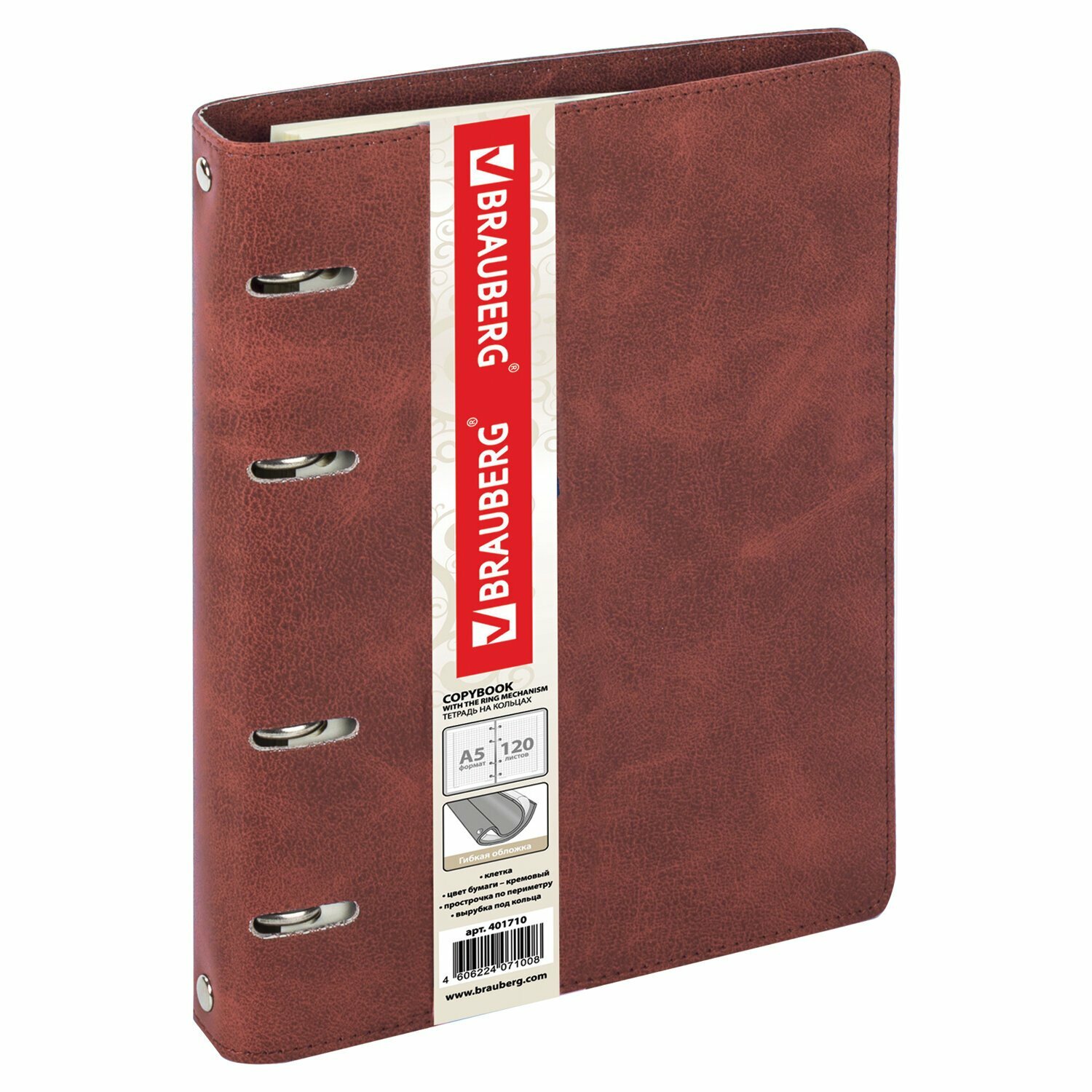 Тетрадь на кольцах А5 (180х220 мм), 120 листов, под кожу, клетка, BRAUBERG "Main", коричневый, 401710 В комплекте: 1шт.