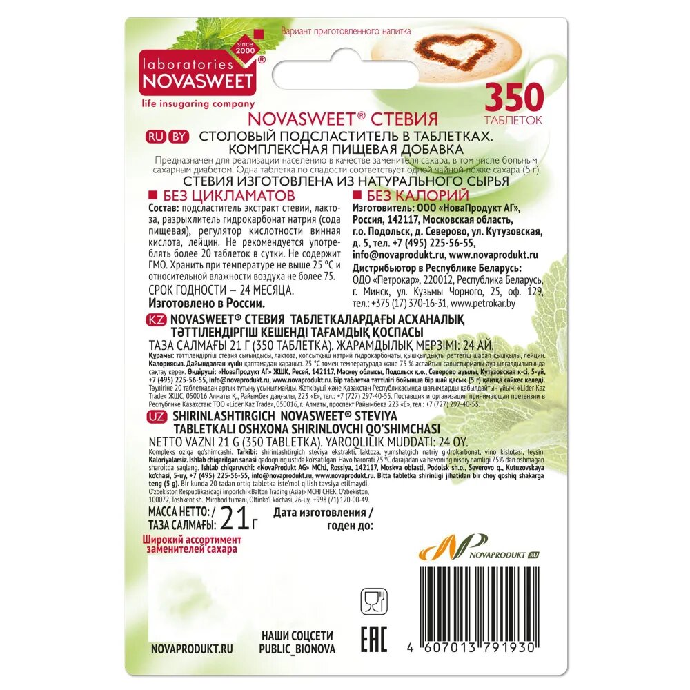 Novasweet, Заменитель сахара в таблетках "Стевия",