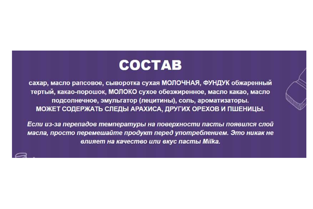 | Состав | сахар, масло подсолнечное, сыворотка сухая молочная, фундук обжаренный тертый, молоко сухое обезжиренное, какао-порошок, масло какао, эмульгатор (лецитин подсолнечный), соль, ароматизаторы. Может содержать следы арахиса, других орехов и пшеницы |