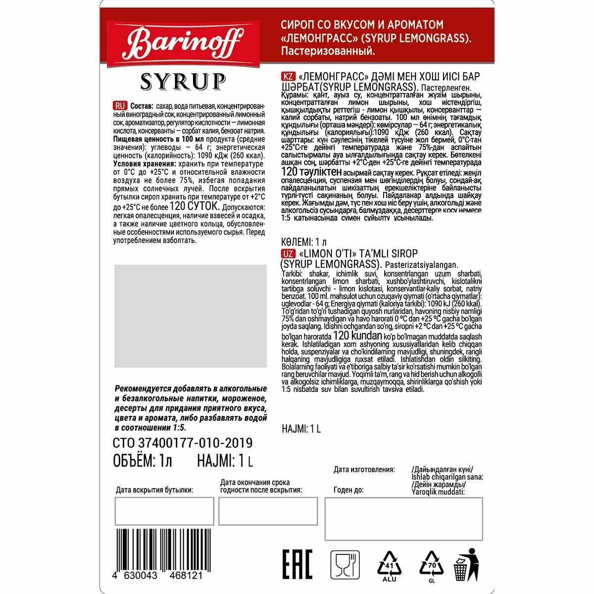 Купить Сироп Barinoff Лемонграсс (для коктейлей, десертов, лимонада и мороженого), 1л