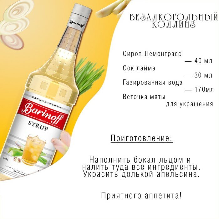СохранитьСироп Barinoff Лемонграсс (для коктейлей, десертов, лимонада и мороженого), 1л интересное: