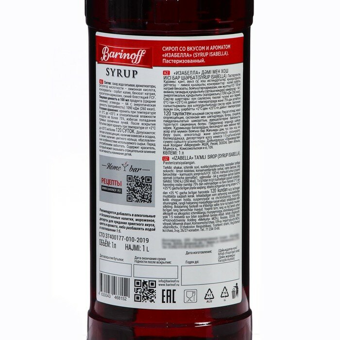 Купить Сироп Barinoff Изабелла (для коктейлей, десертов, лимонада и мороженого), 1л