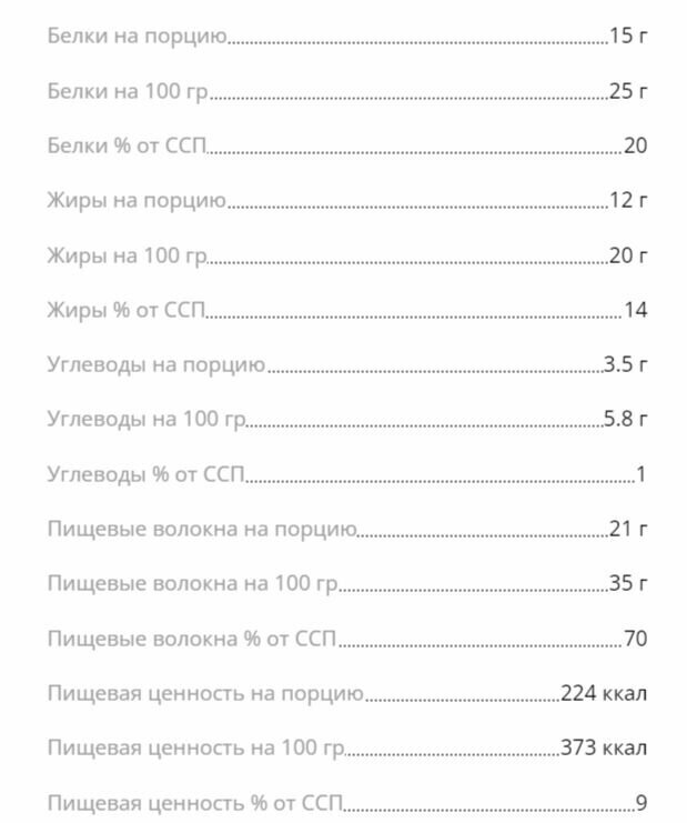 | Энергетическая ценность на 100 г | содержание белков в 100 г: 25 г; содержание жиров в 100 г: 18.4 г; содержание углеводов в 100 г: 4.7 г; калорийность 100 г: 325 ккал |