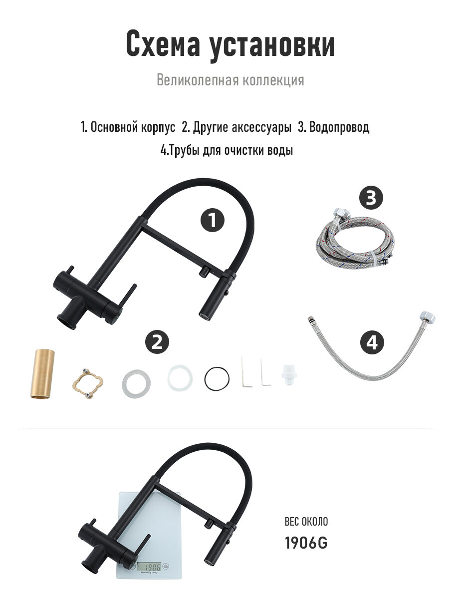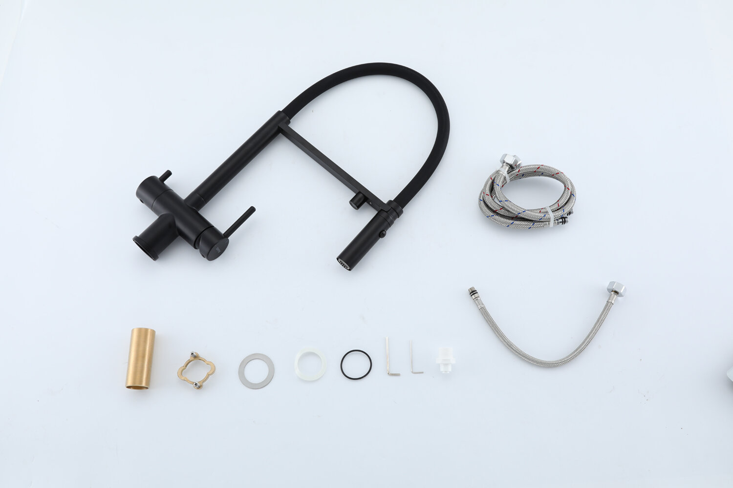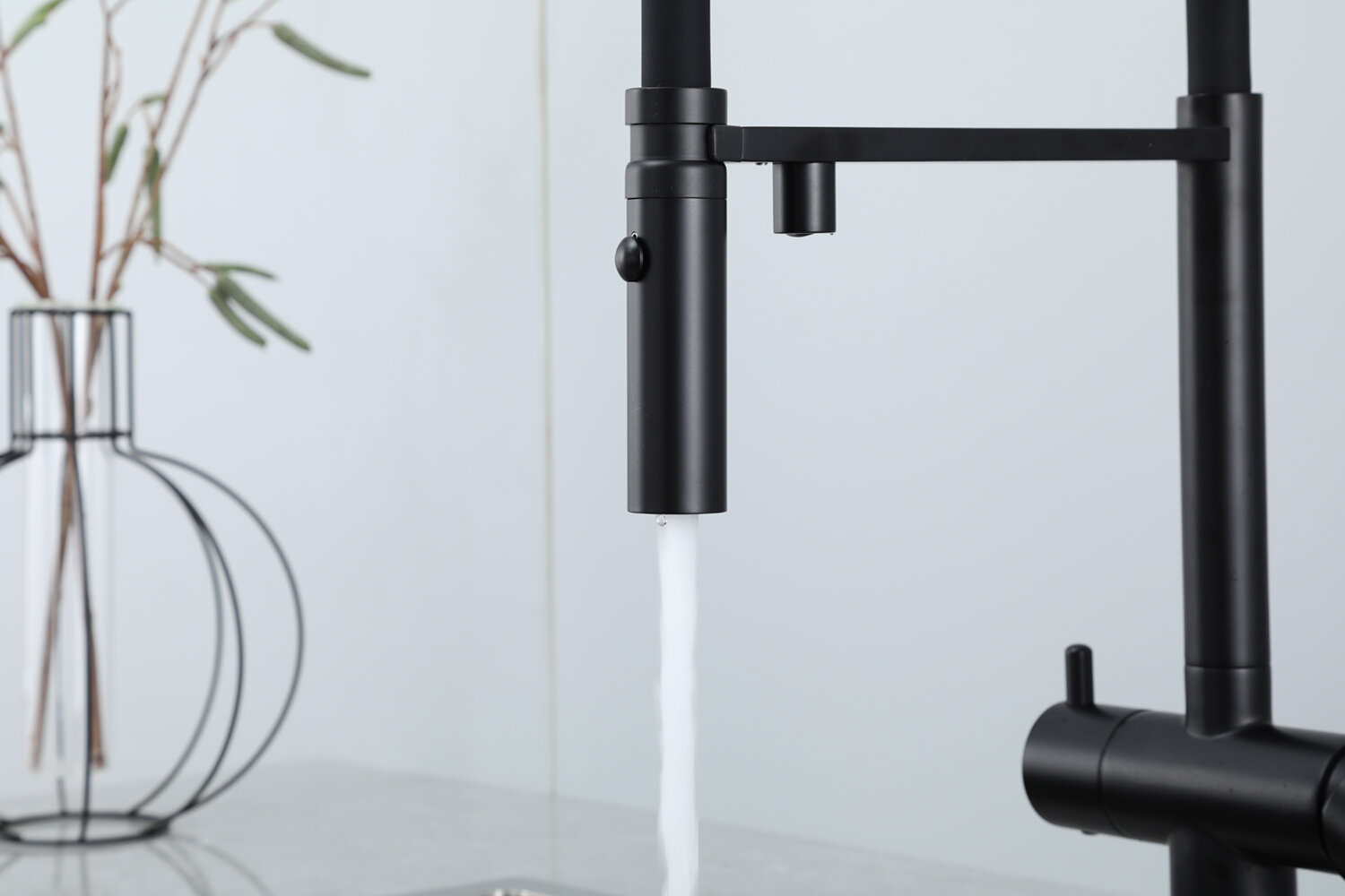 Смеситель для кухни с гибким изливом и подключением фильтра питьевой воды, черный матовый