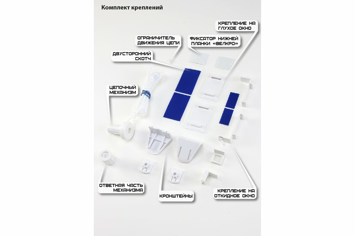 | Комплектация | штора "День-ночь" с трубой, ограничитель, цепочный механизм с заглушкой, заглушка-фиксатор, фиксирующая профильная планка, держатели, площадка с двусторонним скотчем, утяжелитель, навесной кронштейн, зажим, шурупы, фиксатор для цепочки |