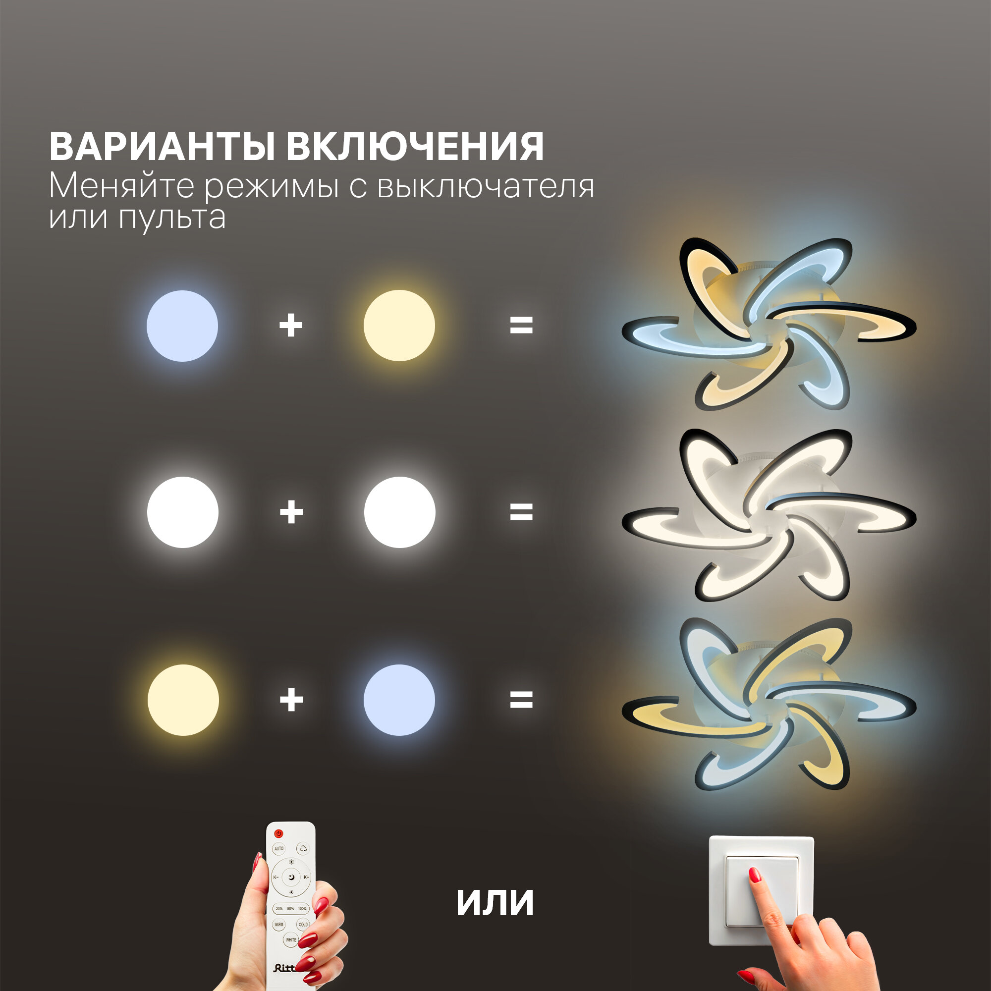 | Дополнительная информация | изменение цветовой температуры свечения (от 2700 К до 6400 К); комбинирование цветовых температур; регулировка яркости; технология Double Light; ночной режим; цветовые режимы работы: 2700К + 6400K / 4200К / 6400К + 2700K; |