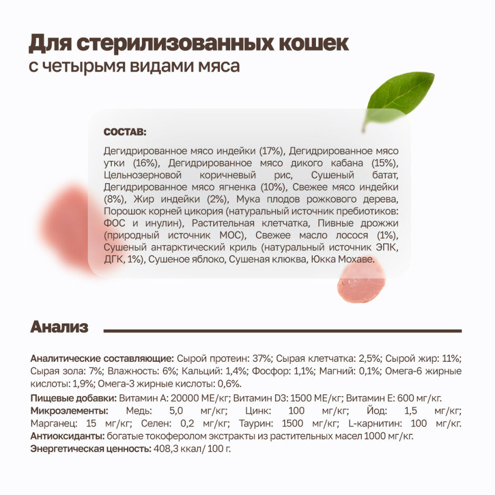 | Состав | дегидрированное мясо индейки, дегидрированное мясо утки, дегидрированное мясо кролика, цельный бурый рис, сушеный сладкий картофель (батат), дегидрированное мясо ягненка, свежее мясо индейки, жир индейки, мука из плода рожкового дерева, сушеный цикорий (натуральный источник пребиотиков: fos и инулина), пищевые волокна, пивные дрожжи (натуральный источник mos), cушеный антарктический криль (натуральный источник epa и dha), свежие масло лосося, сушеные яблоки , таурин, сушеная клюква, юкка шидигера, l-карнитин, комплекс натуральных антиоксидантов (экстракт розмарина, грейпфрута, апельсина, куркумы и сизигиума), живые пробиотики (enterococcus faecium). Сохранено витамином С, розмарином и смесью природных токоферолов (источник натурального витамина Е) |